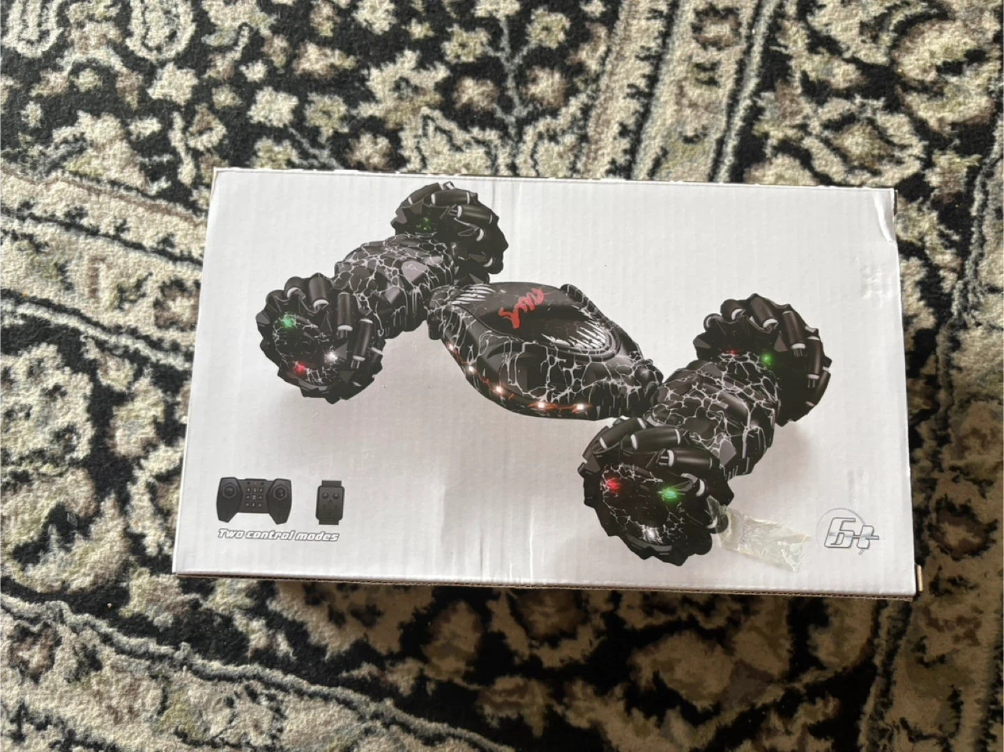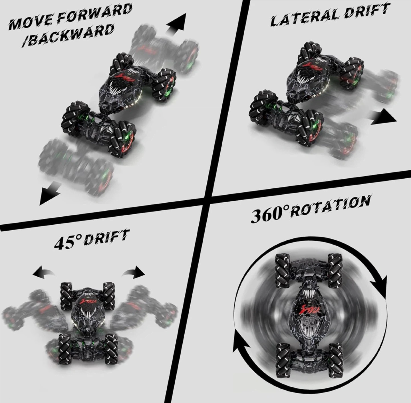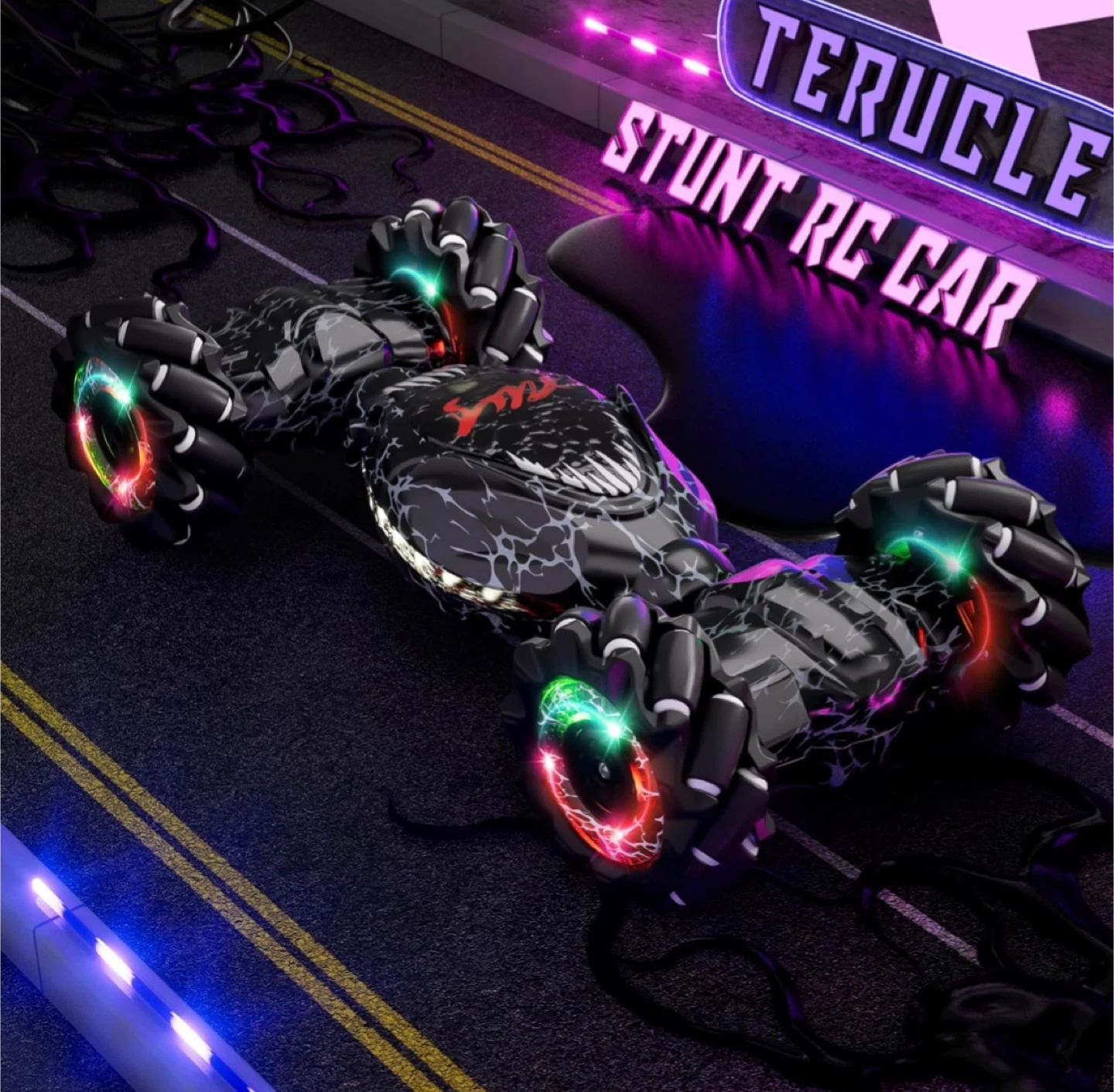 This is a double-sided driving RC stunt car featuring 360° rotation and lateral drift capabilities. It includes both a standard remote control and a gesture-controlled wristband for interactive play. Built for off-road fun, it lights up with colourful LEDs as it moves!
