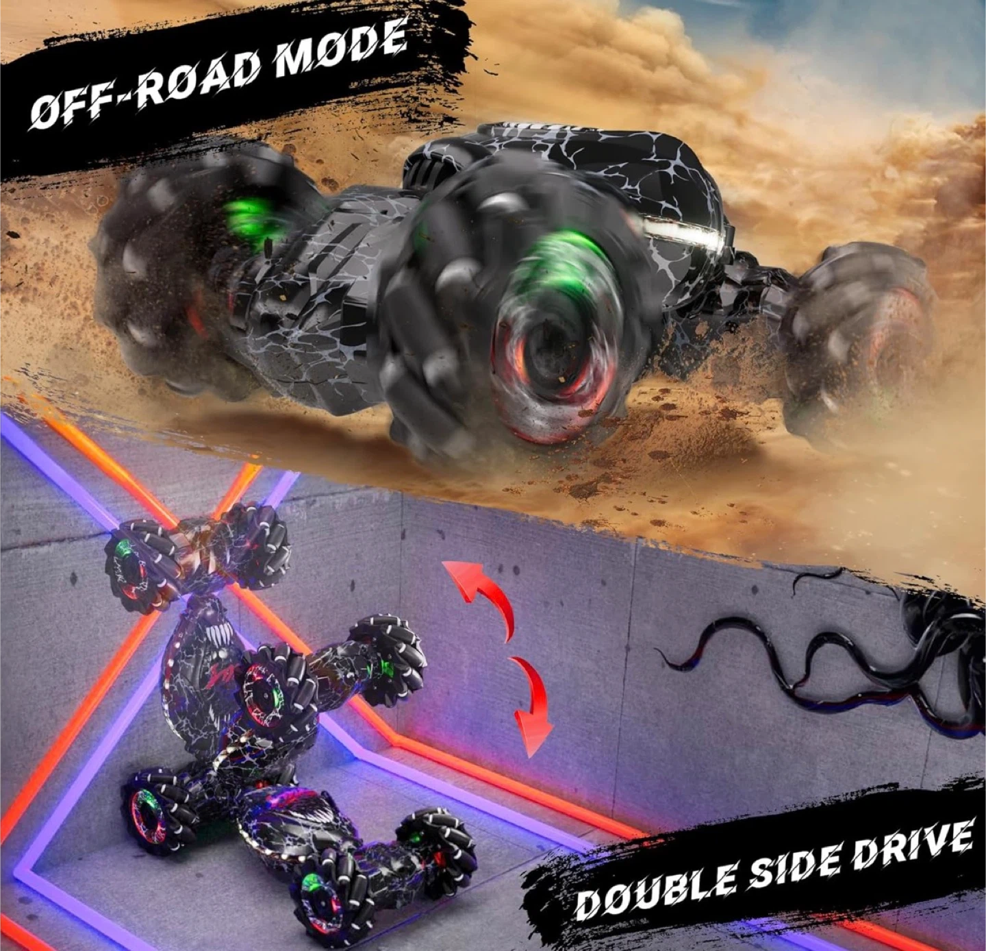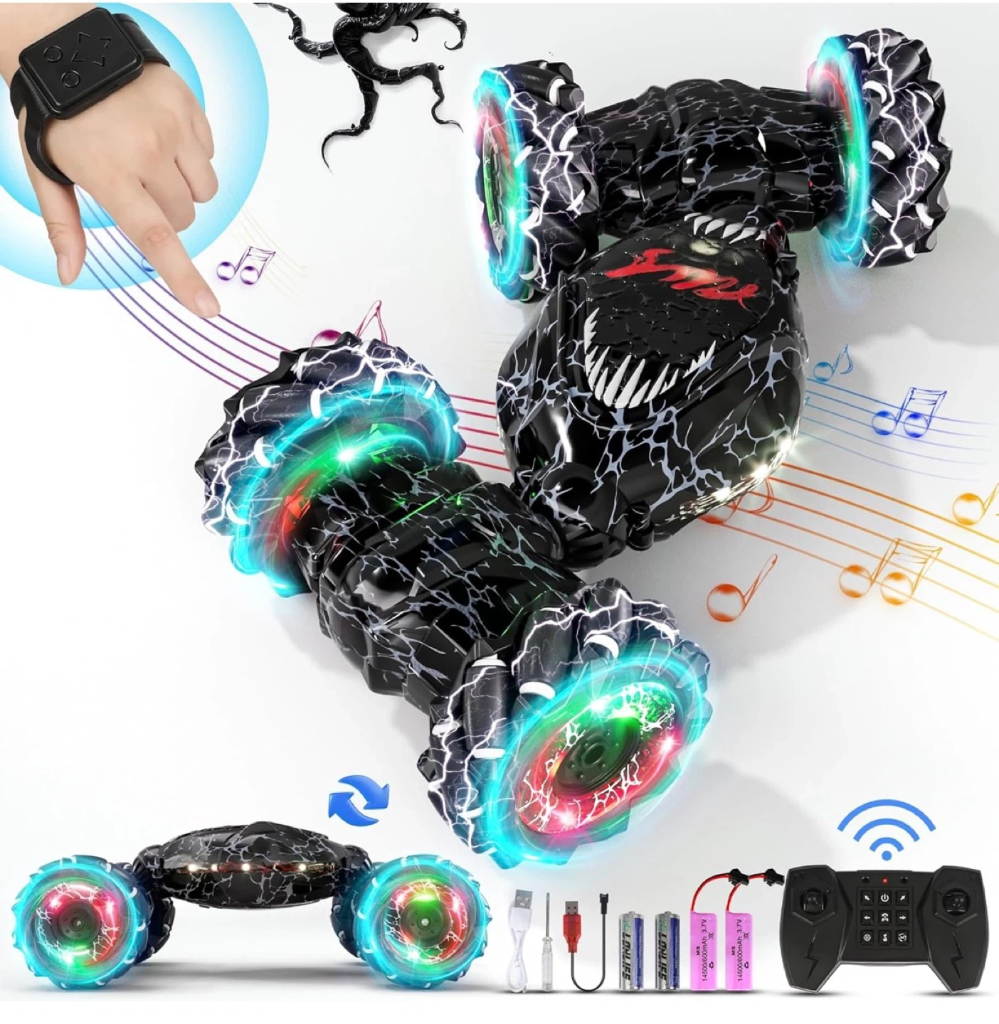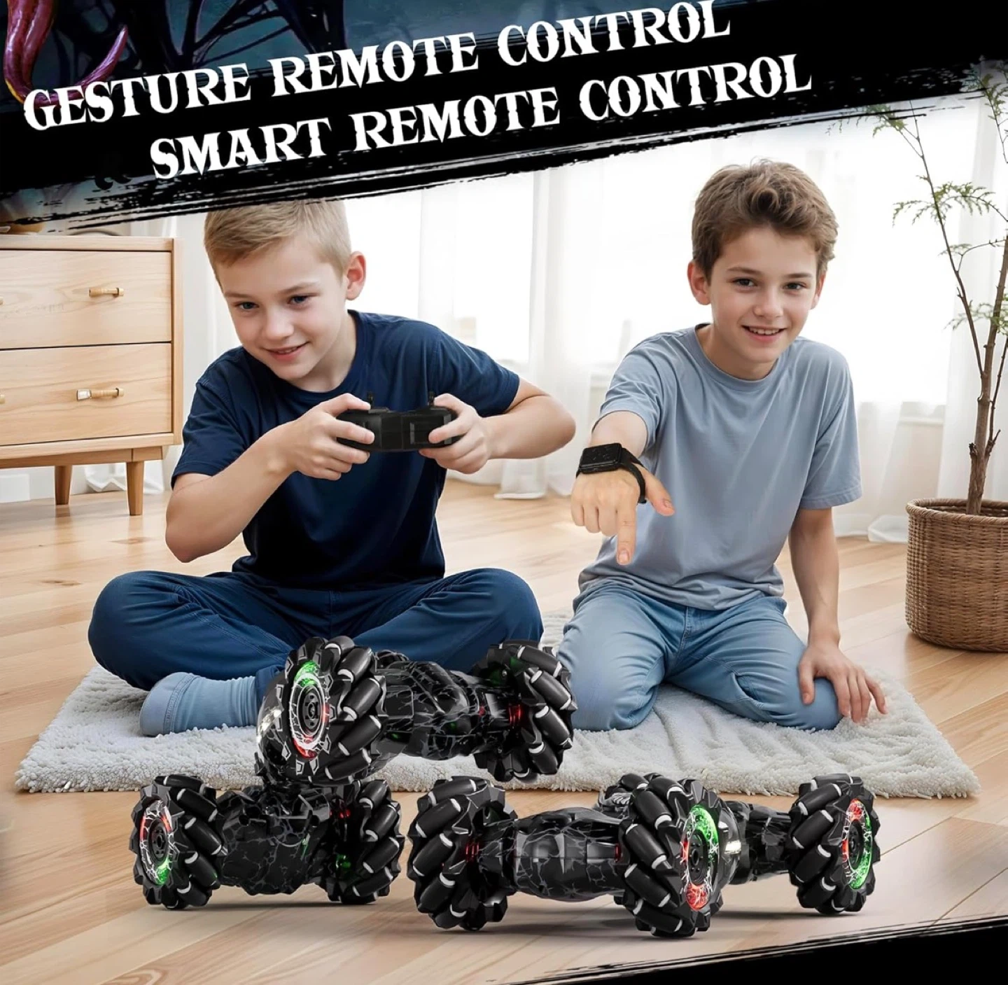 This is a double-sided driving RC stunt car featuring 360° rotation and lateral drift capabilities. It includes both a standard remote control and a gesture-controlled wristband for interactive play. Built for off-road fun, it lights up with colourful LEDs as it moves!