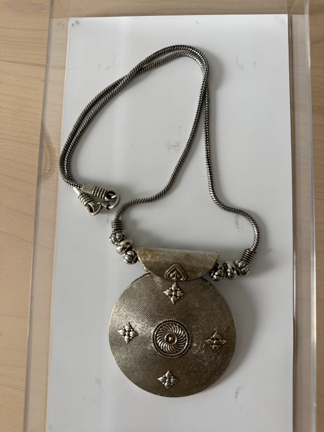 This necklace features a large, round pendant with intricate detailing and a snake chain. It's a statement piece with a vintage-inspired look. The metal appears to be silver-tone.