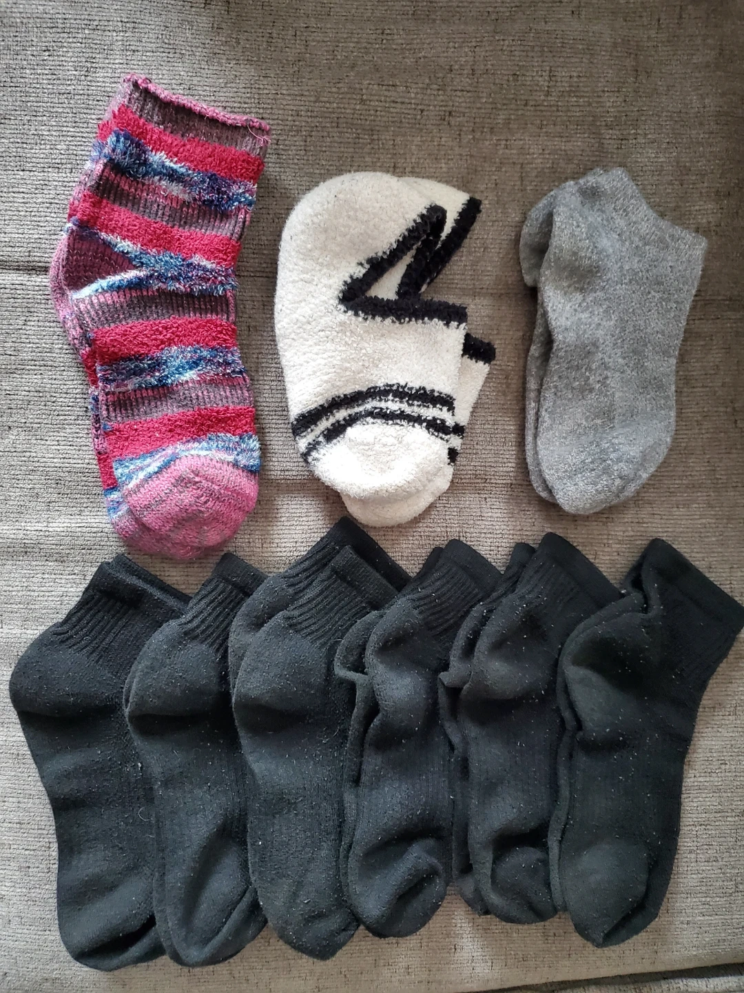 Includes 6 pairs of black ankle socks, one pair of fuzzy white and black striped socks, one pair of colourful striped fuzzy socks, and one pair of grey ankle socks. Great for everyday wear! All are in good condition, no holes. $5 for all.