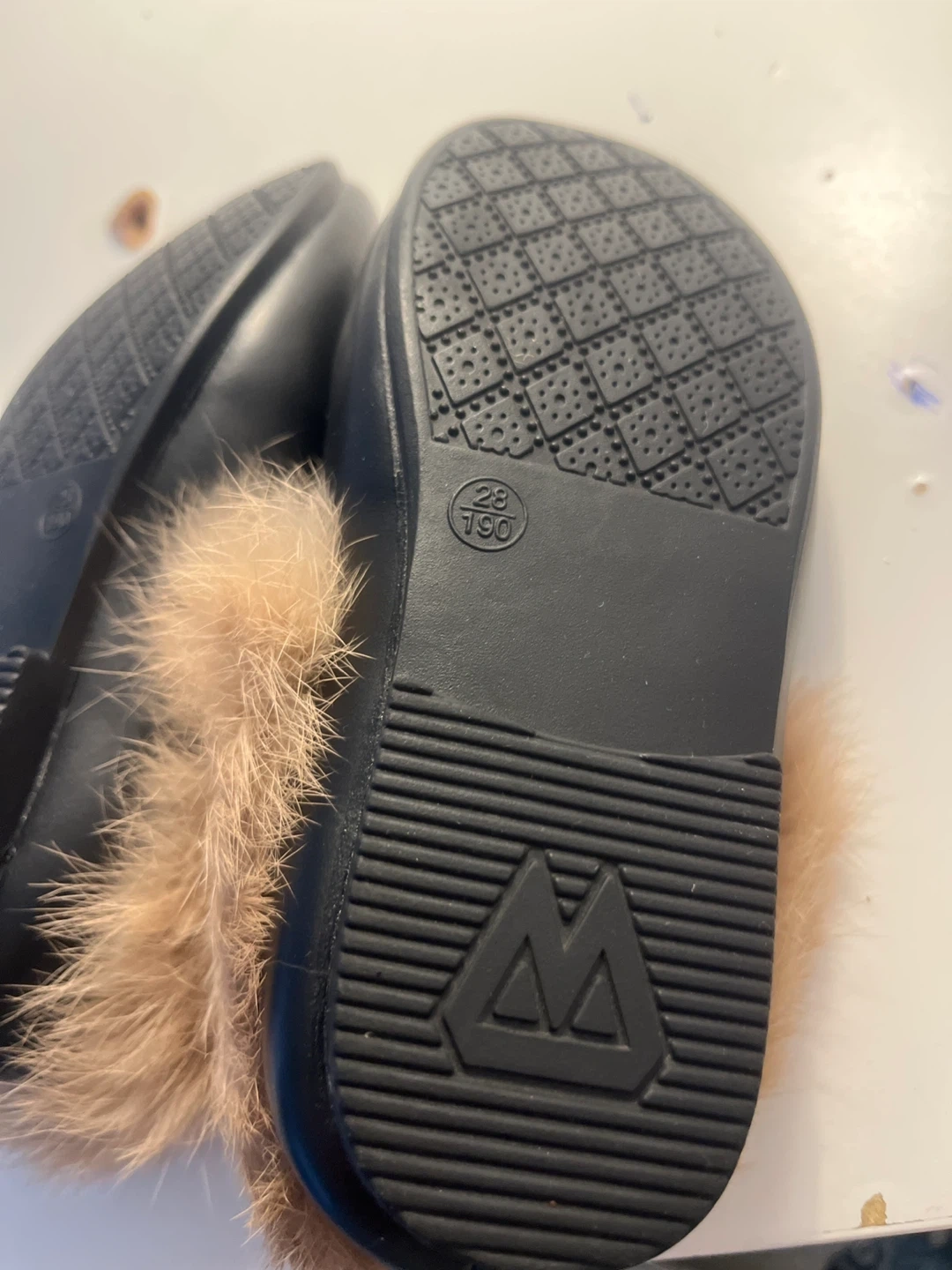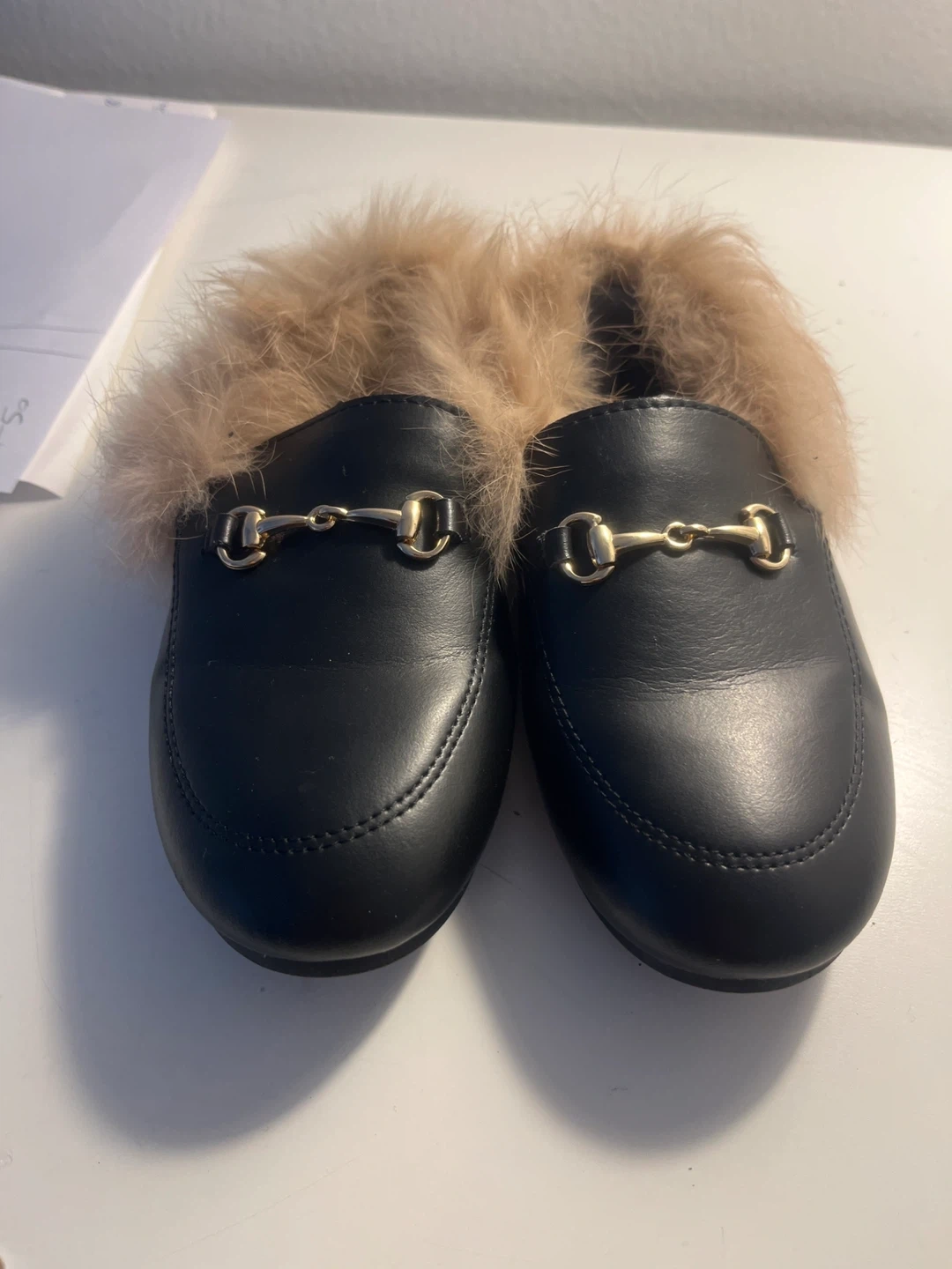 Cute black faux leather loafers for girls. They feature a fuzzy trim and gold horsebit detail. The sole size is 28, which is 190mm. Perfect for keeping little feet cozy and stylish!