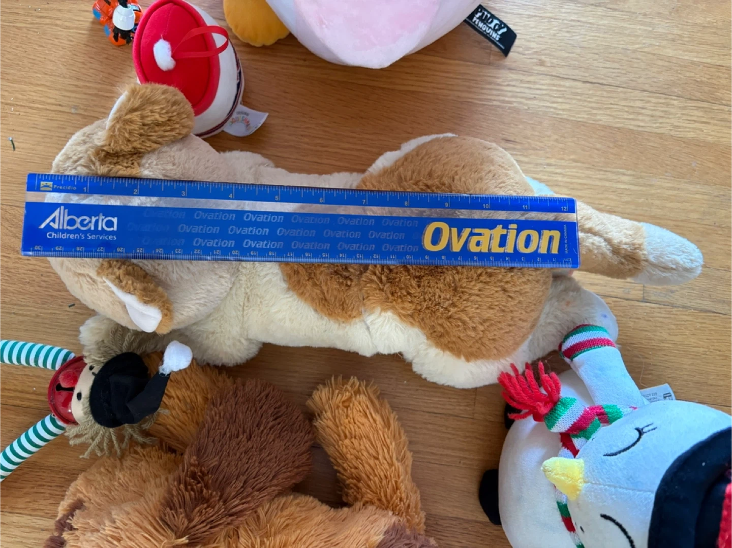 This is a collection of six plush toys from Ovation. Includes a dog, cat, snowman, penguin, and two smaller characters. Measurements vary by toy. 20$ for all . Pickup at Morley trail NW
