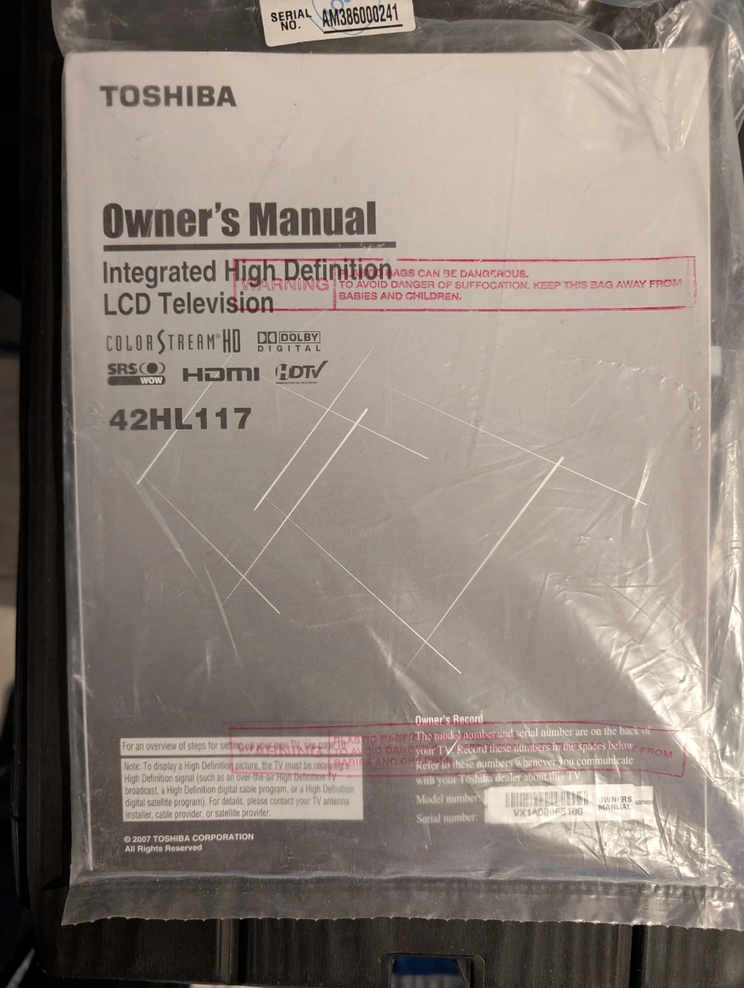 This is a Toshiba 42HL117 Integrated High Definition LCD Television. It includes the owner's manual for setup and operation. This TV supports various display technologies for a quality viewing experience.Remote control included!