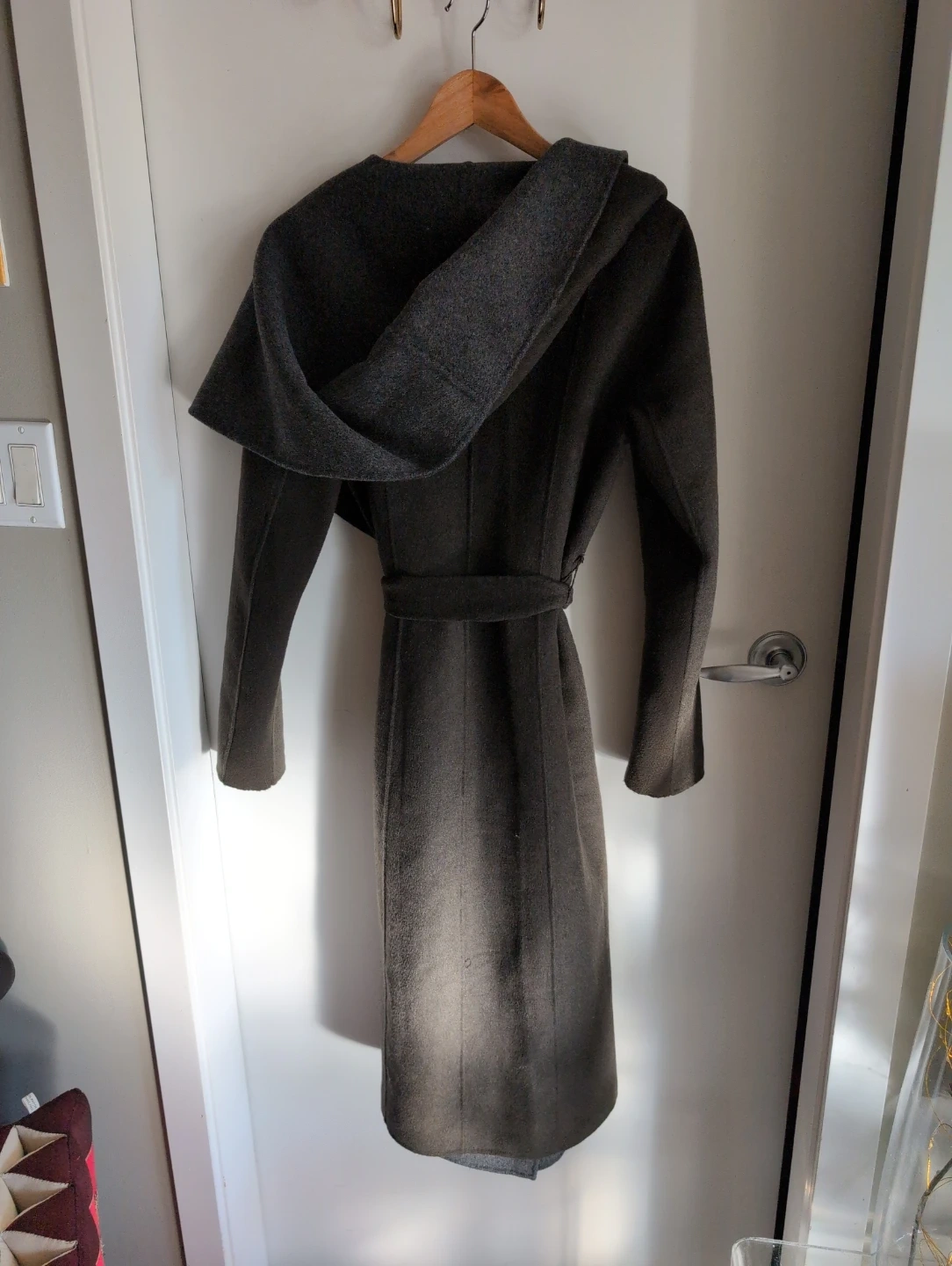 This size S BCBGMAXAZRIA coat is a stylish grey wrap style with a belt. It's made from a wool blend material. A great layering piece for cooler weather!