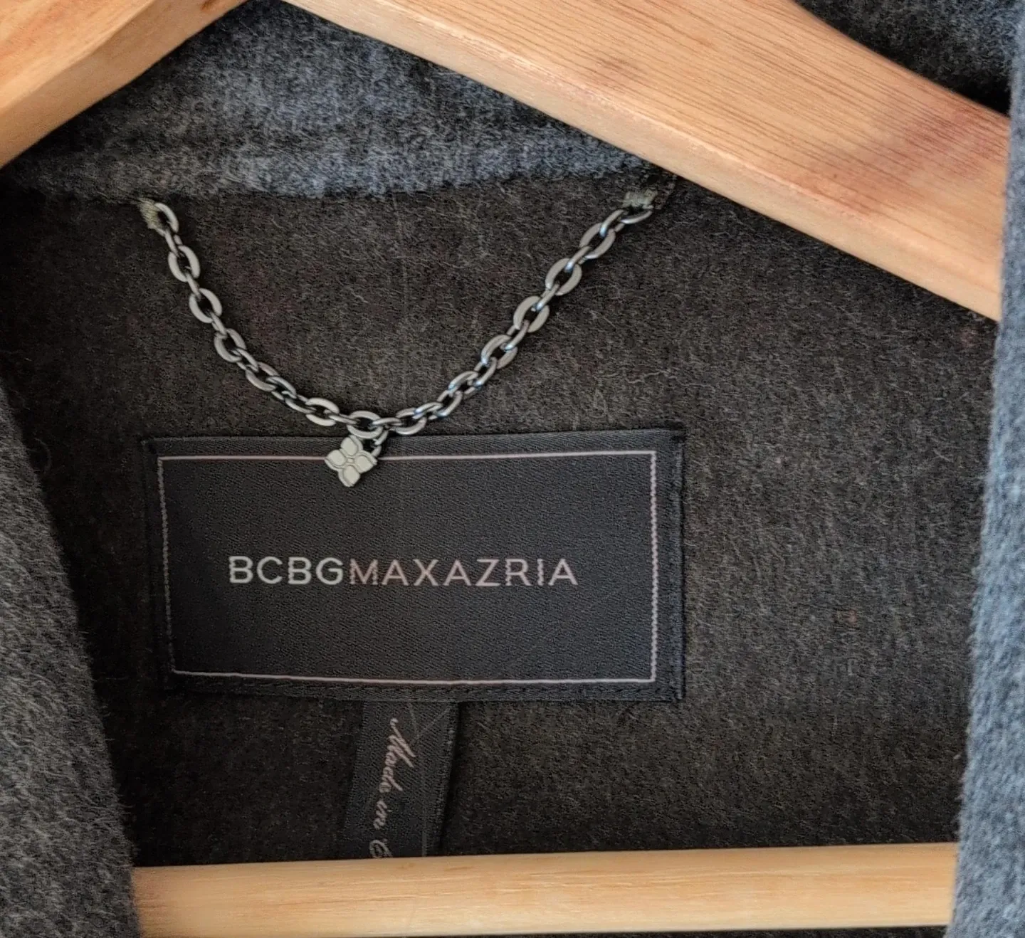 This size S BCBGMAXAZRIA coat is a stylish grey wrap style with a belt. It's made from a wool blend material. A great layering piece for cooler weather!