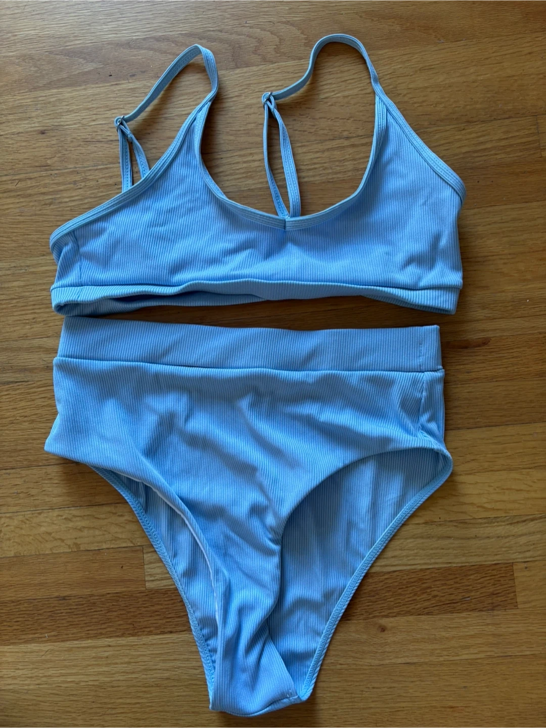 Two-piece light blue ribbed bikini set. Made from 100% polyester. This bikini is a size medium. Pickup at Morley trail NW