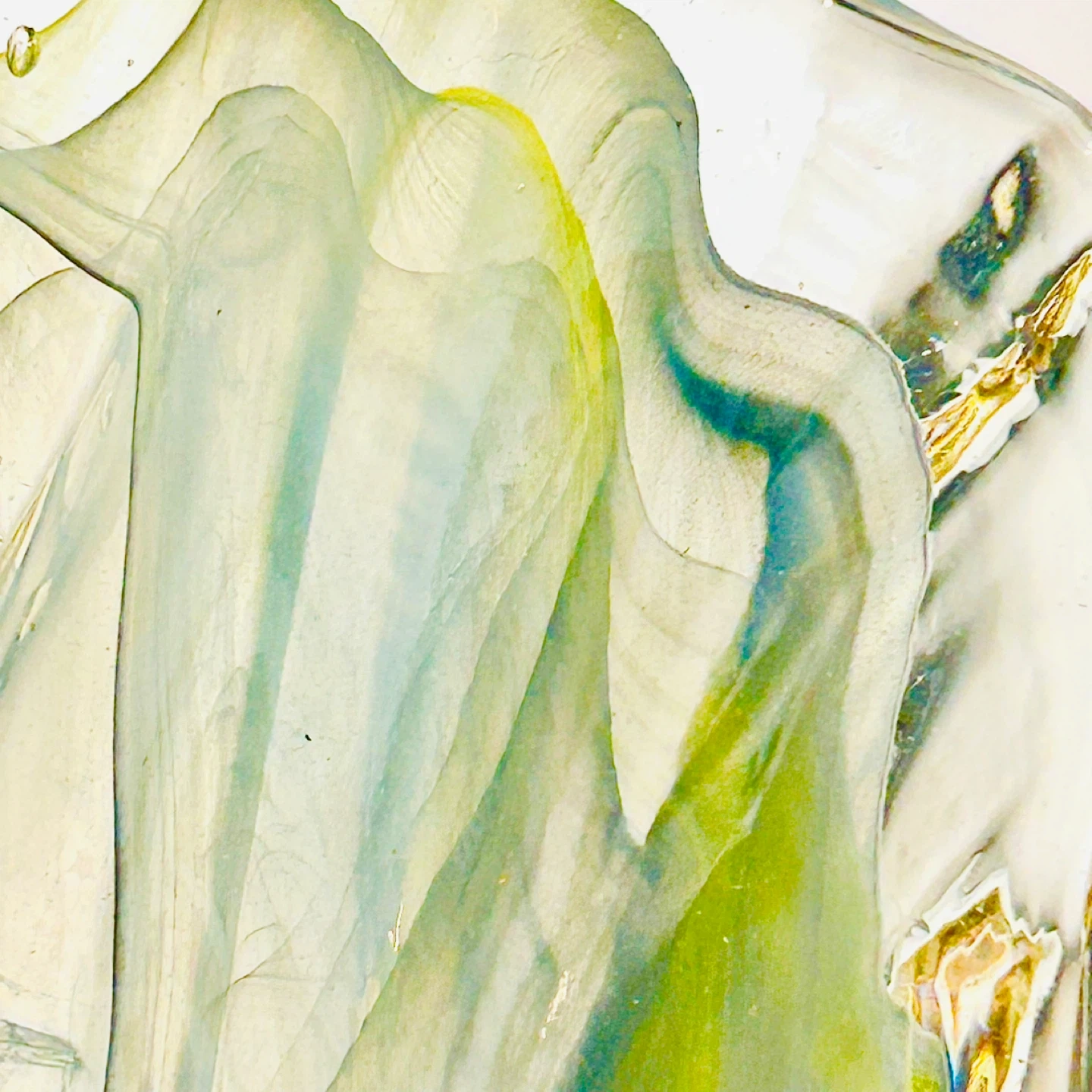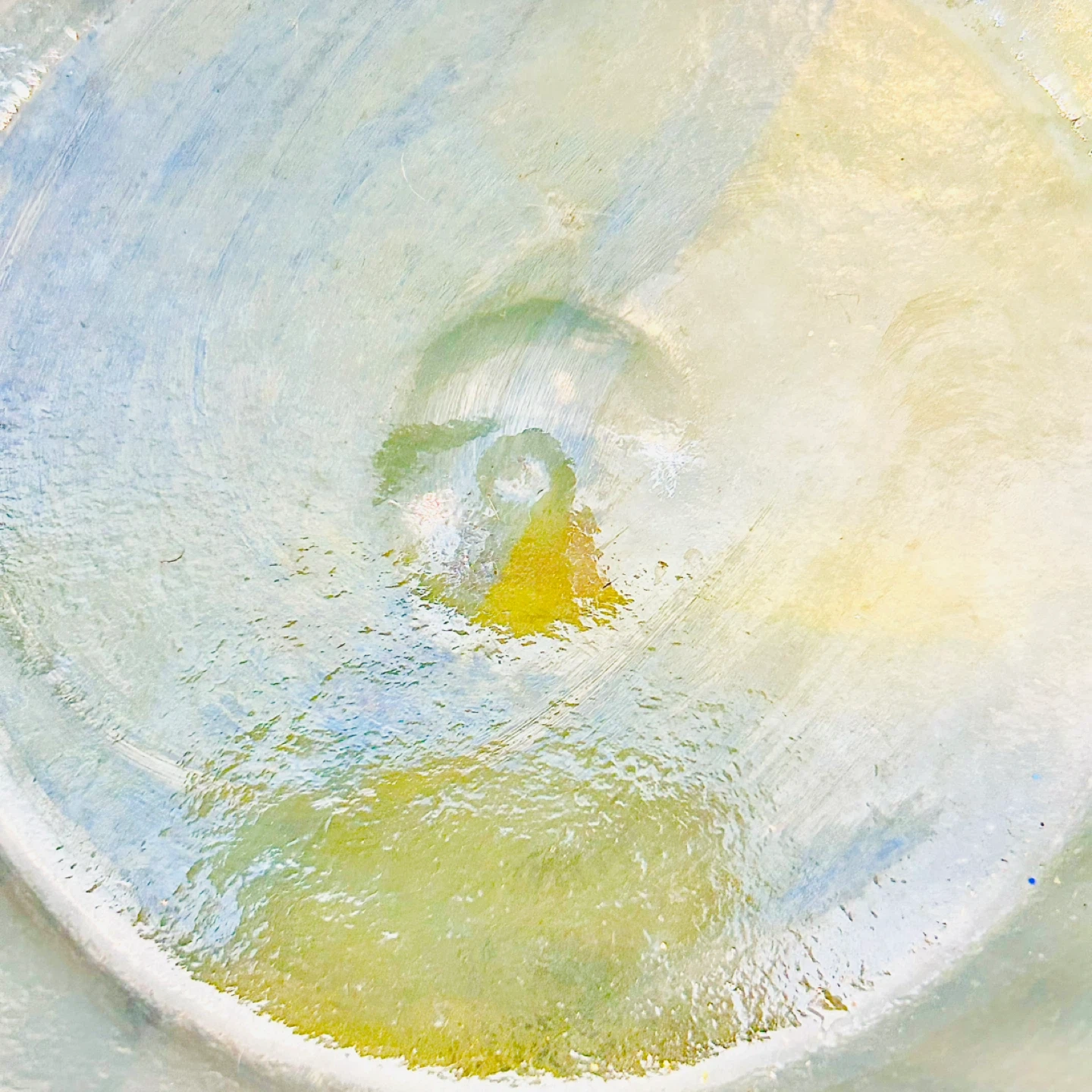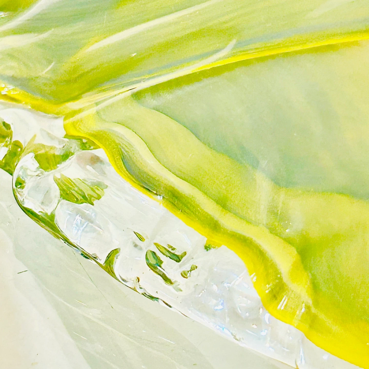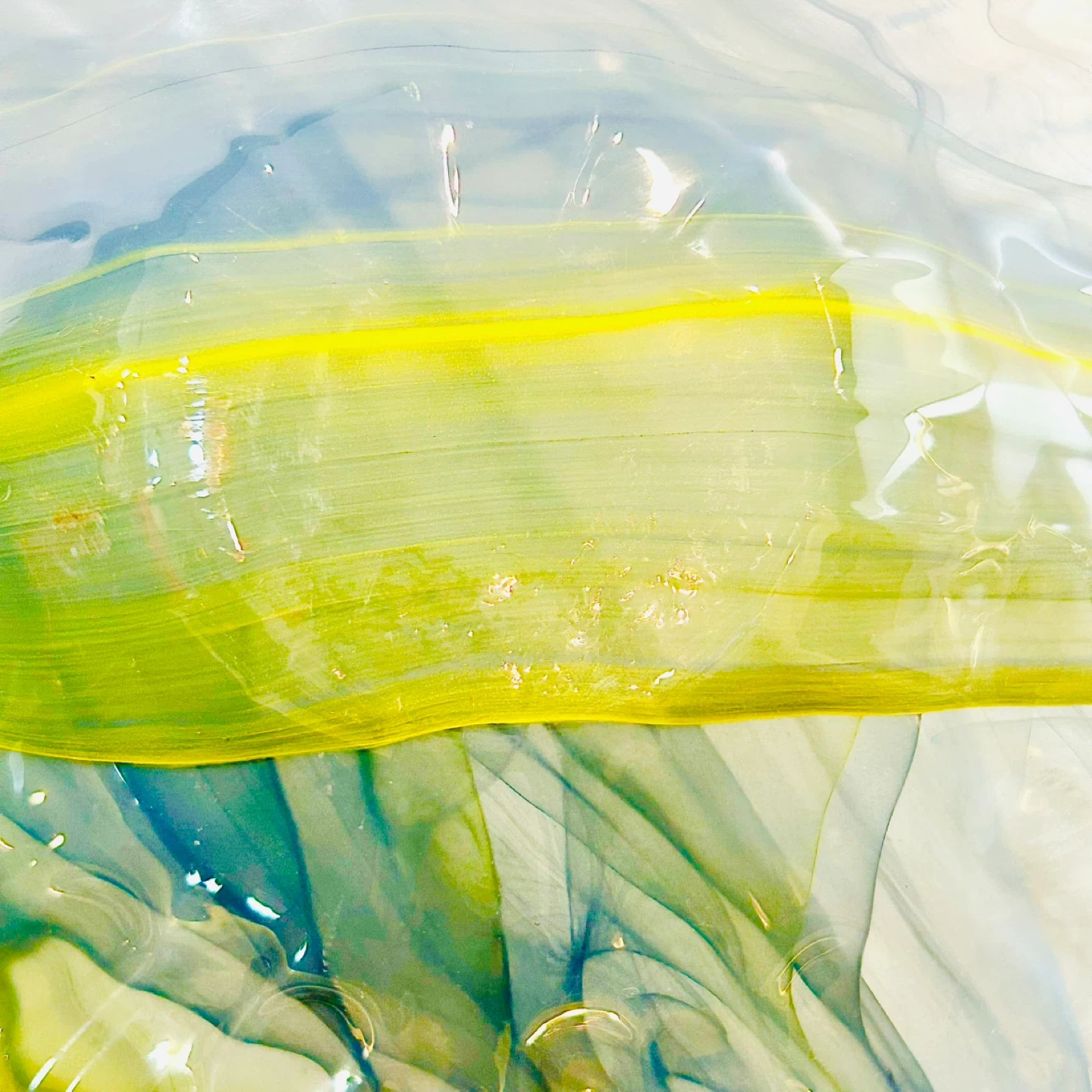 Search terms: aqua, teal, turquoise, cerulean, ice blue, seafoam, chartreuse, citron, lemon yellow, opaline, translucent, cased glass, layered glass, studio glass, sculptural bowl.