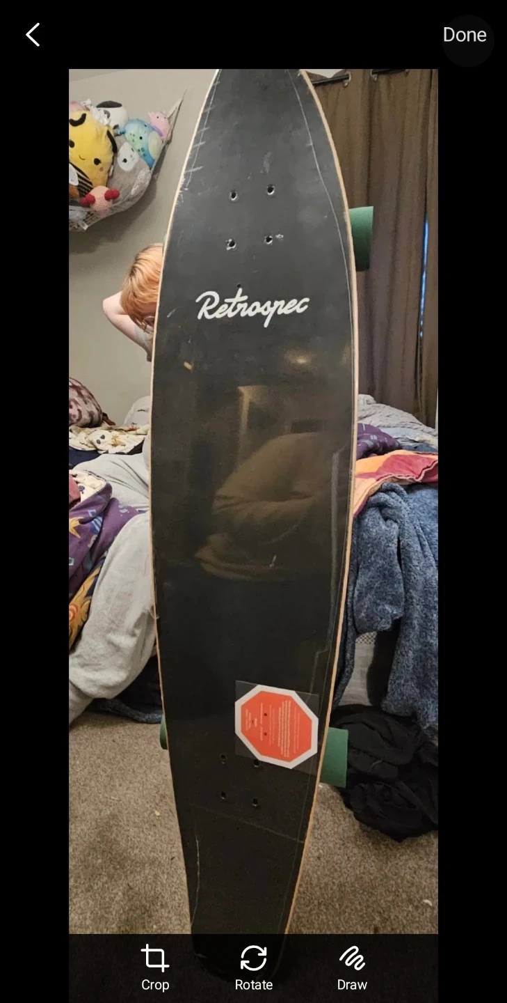Retrospec longboard has a bamboo deck with a tropical leaf design on the back. Been in a closet for a few years, but still practically new.