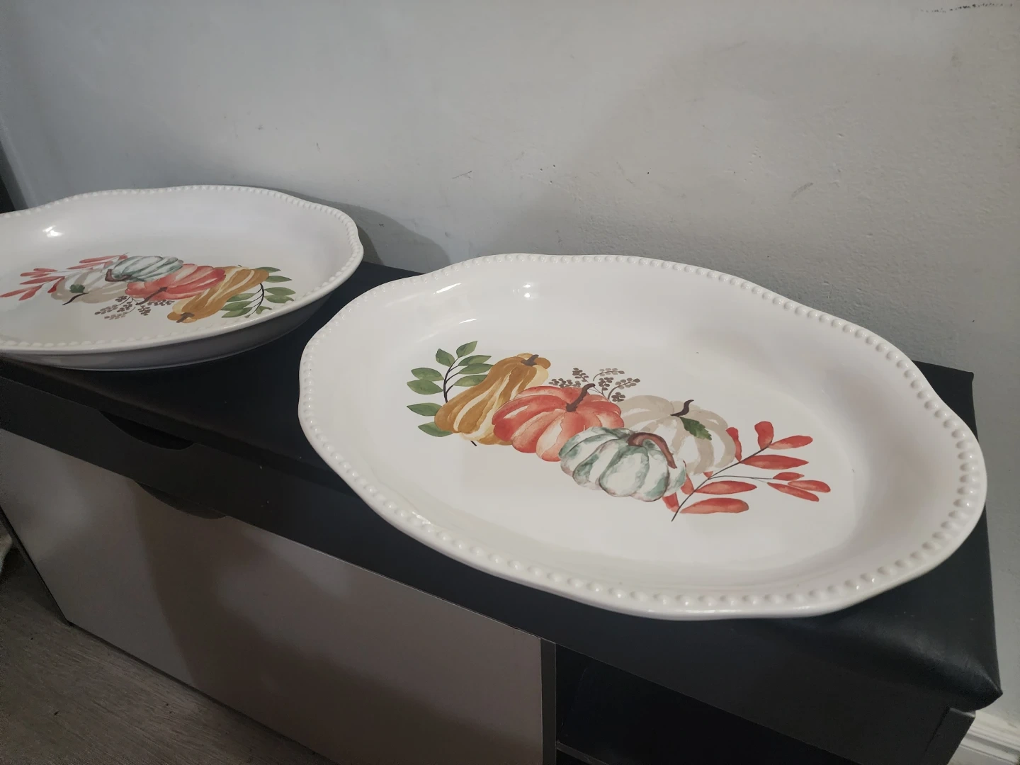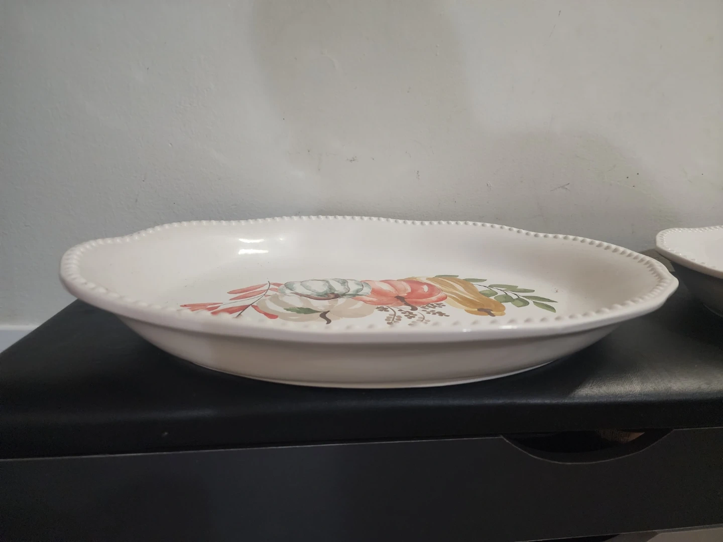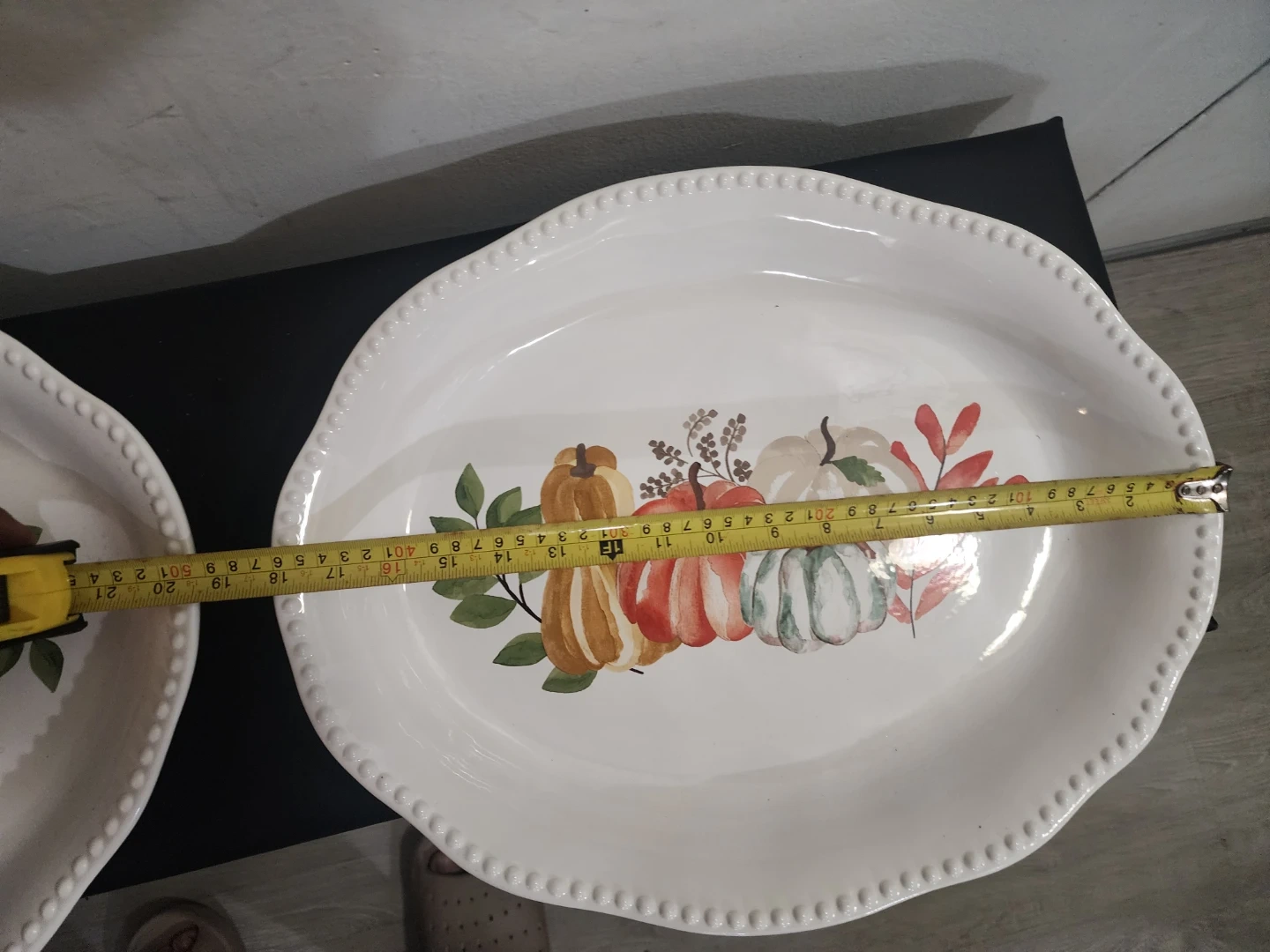 Oval white serving platter featuring a decorative pumpkin design. It's approximately 14 inches long. Dishwasher safe.