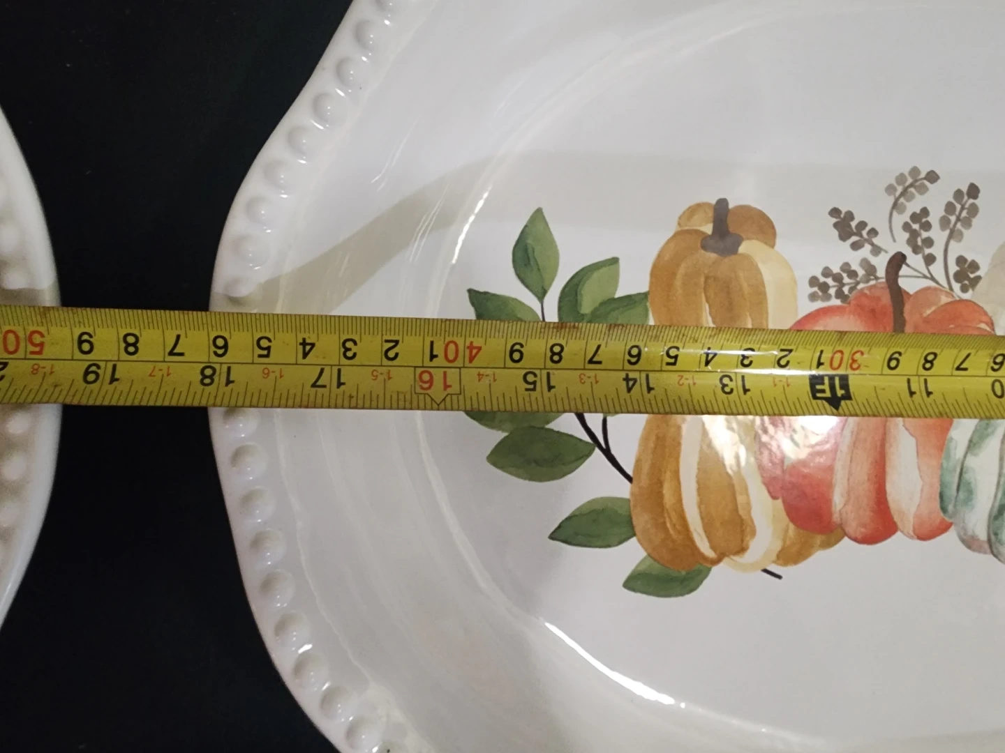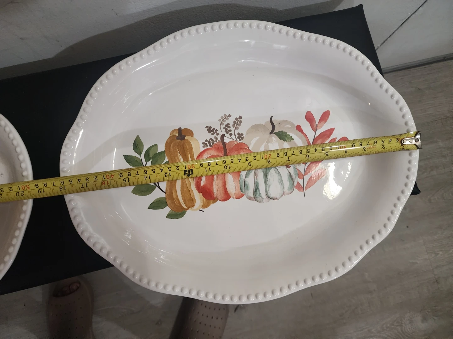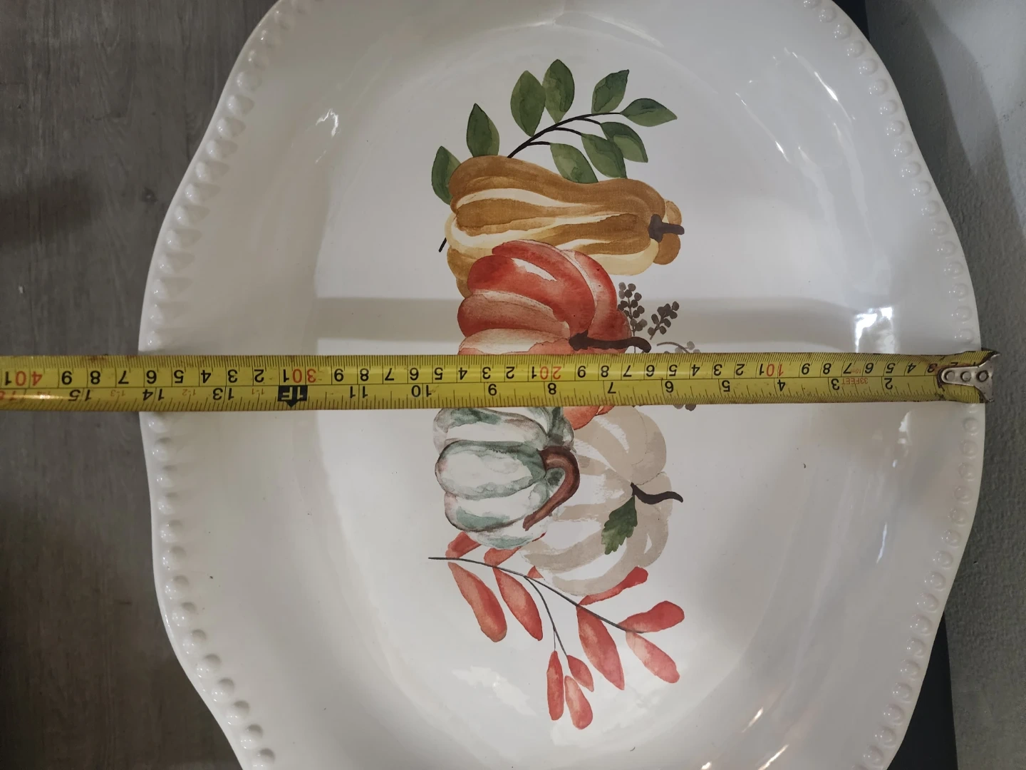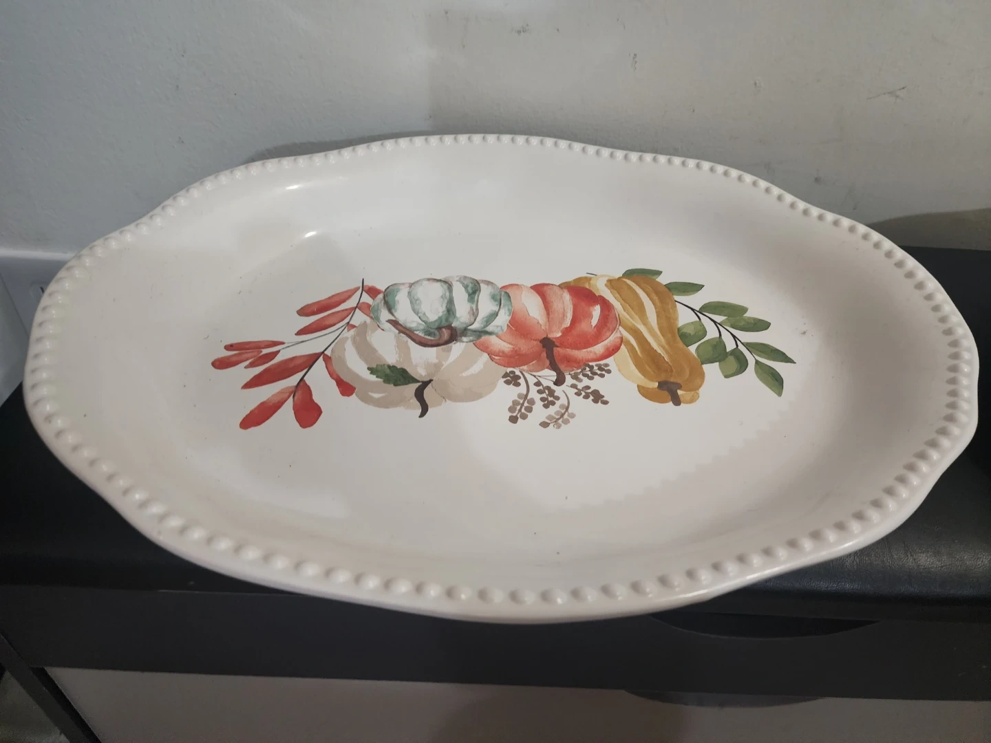 Oval white serving platter featuring a decorative pumpkin design. It's approximately 14 inches long. Dishwasher safe.