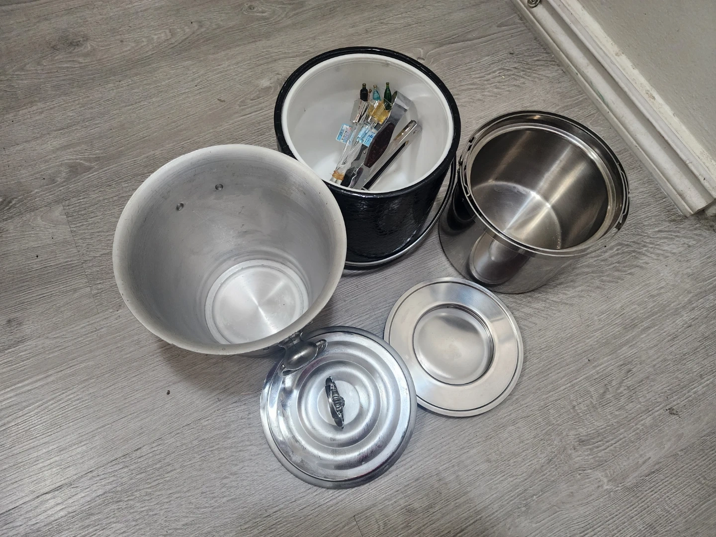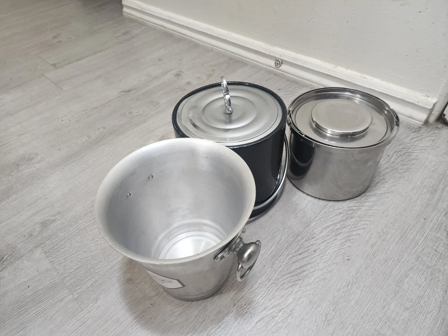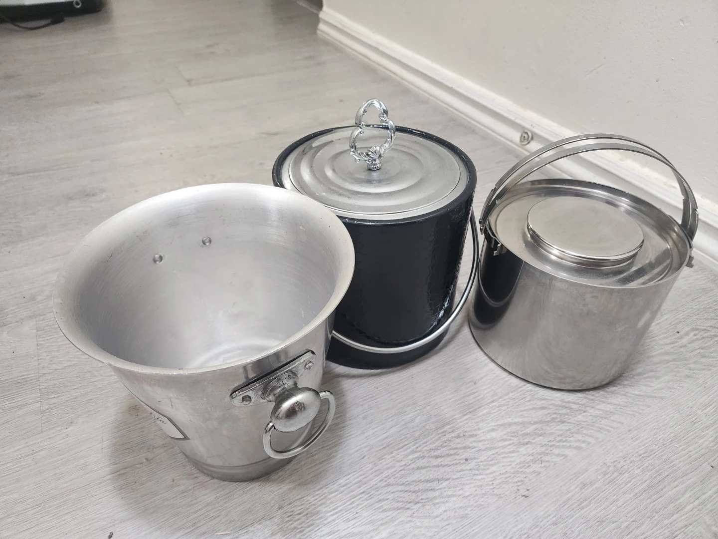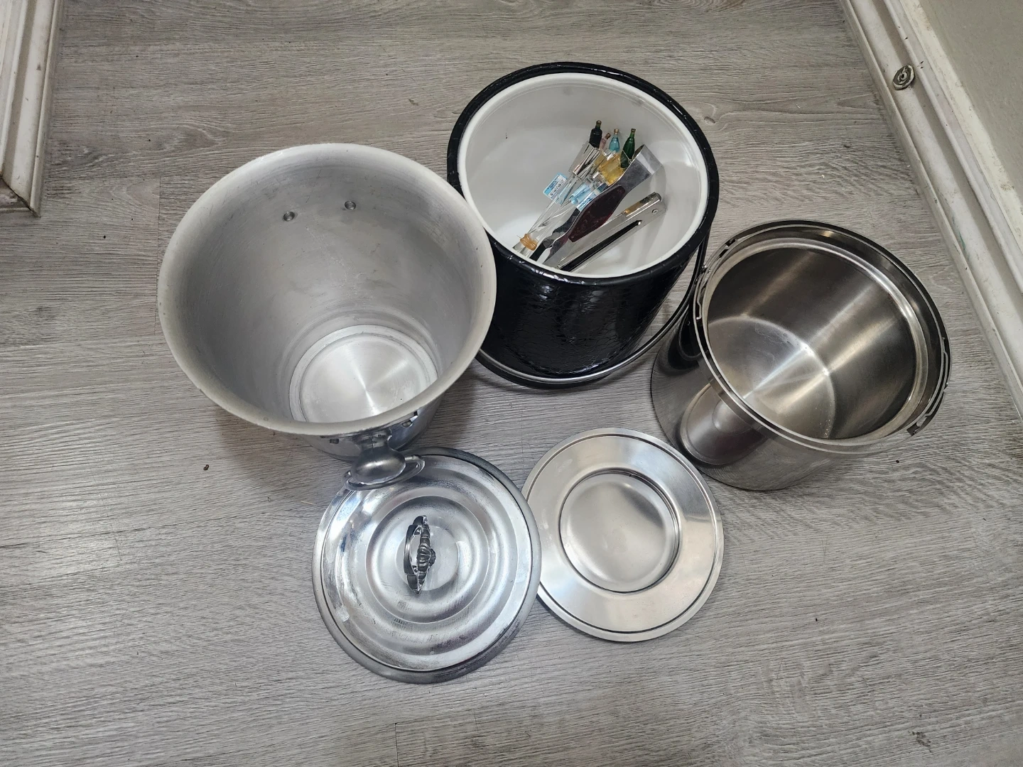 This set includes three ice buckets and a collection of bar tools. The black bucket features a textured finish and comes with tongs and other accessories. The aluminum and stainless steel buckets offer different styles for serving. Great for hosting parties or personal use!