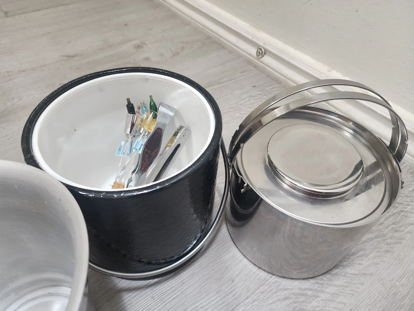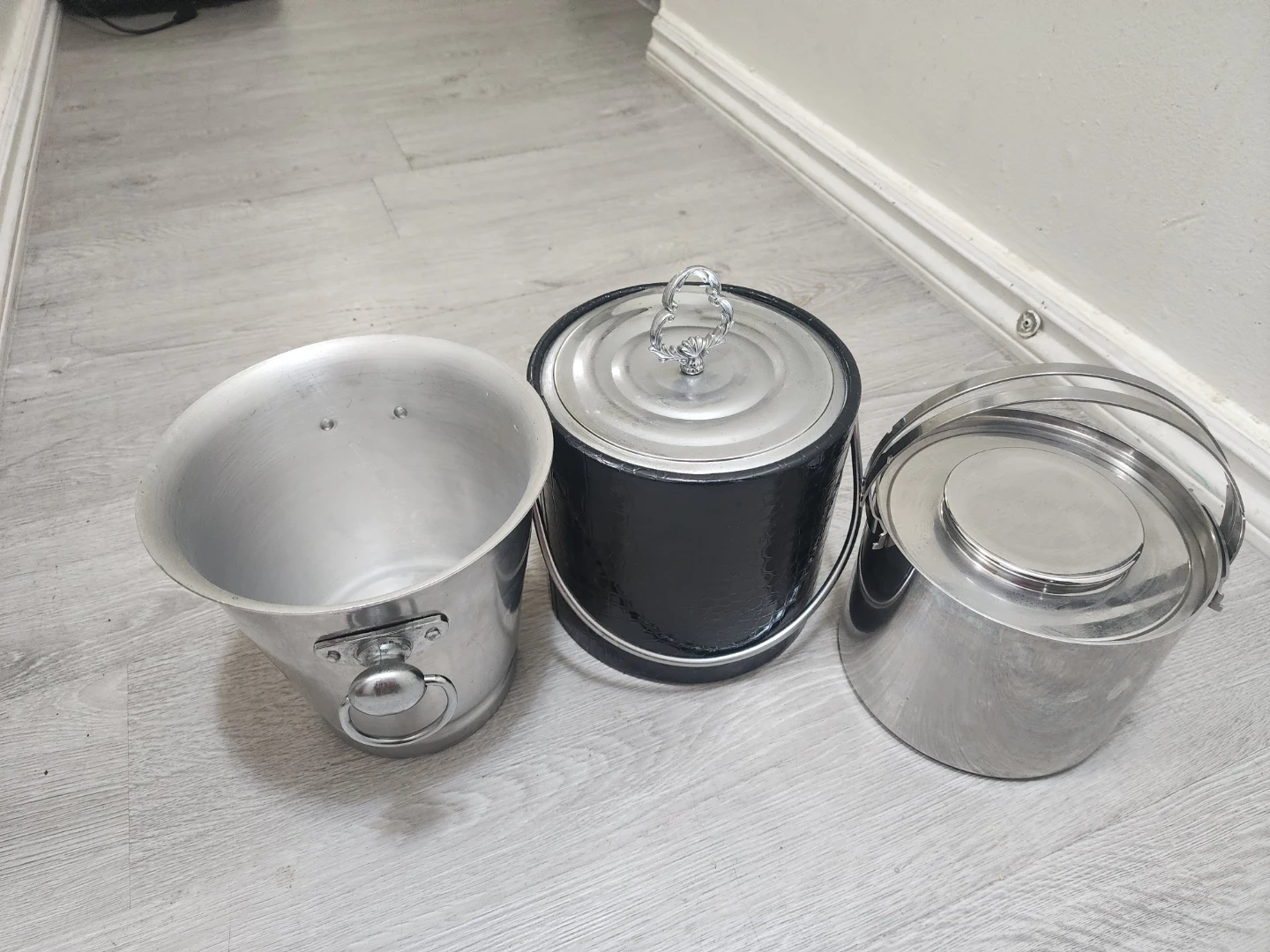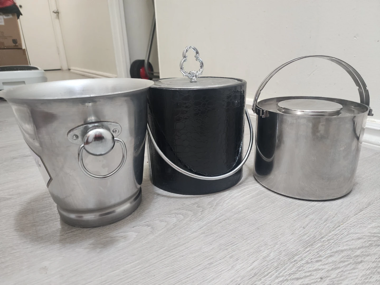 This set includes three ice buckets and a collection of bar tools. The black bucket features a textured finish and comes with tongs and other accessories. The aluminum and stainless steel buckets offer different styles for serving. Great for hosting parties or personal use!