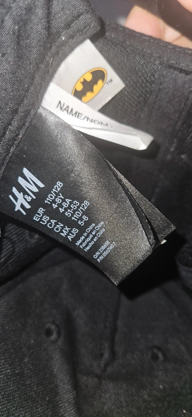 This is a black baseball cap from H&M featuring a gold Batman logo. Adjustable. . It's labelled with sizes EUR 110/128, US 4-8Y, CA 4-8Y, MX 5-8, and AUS 5-8. Made in China.