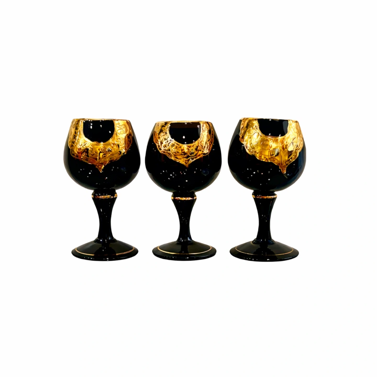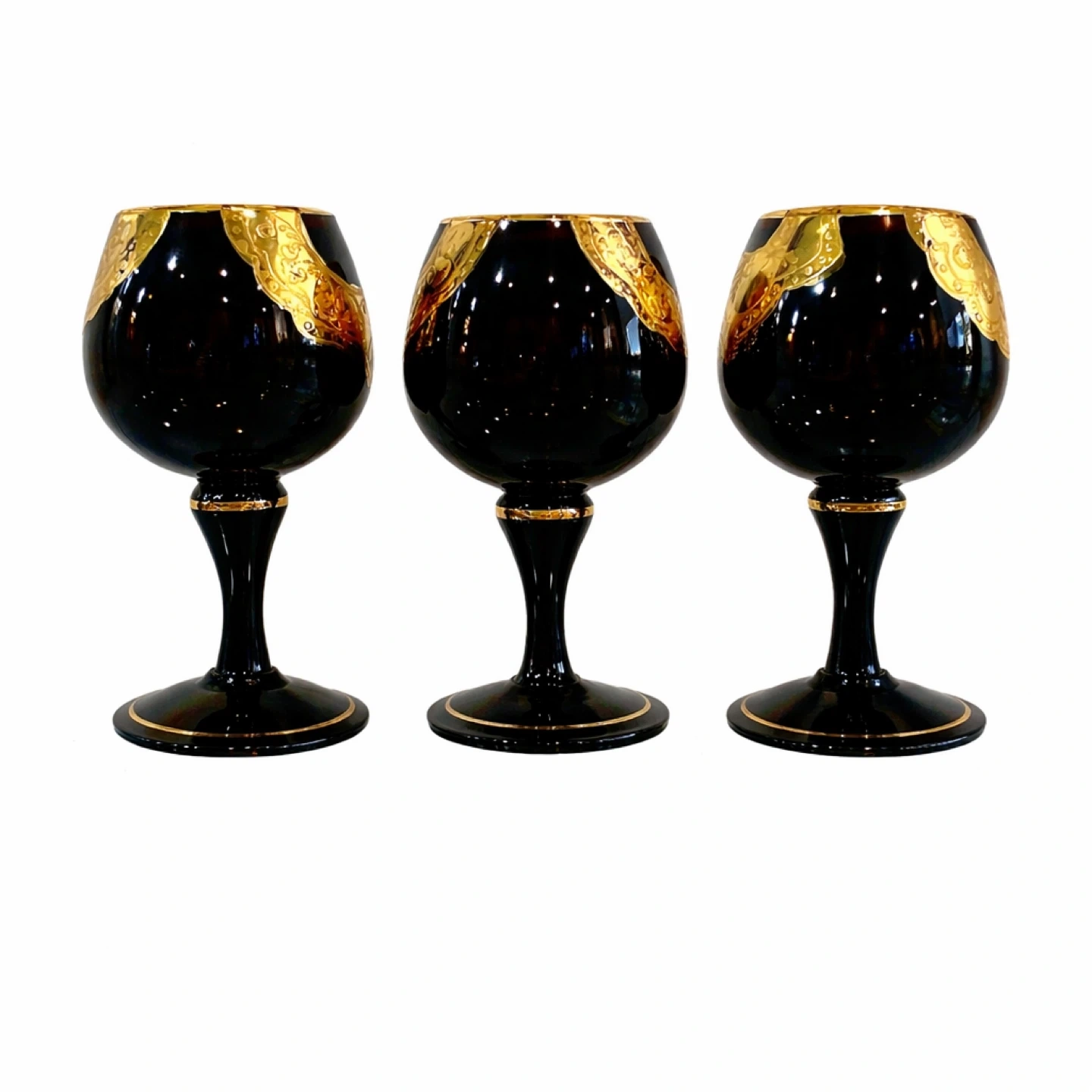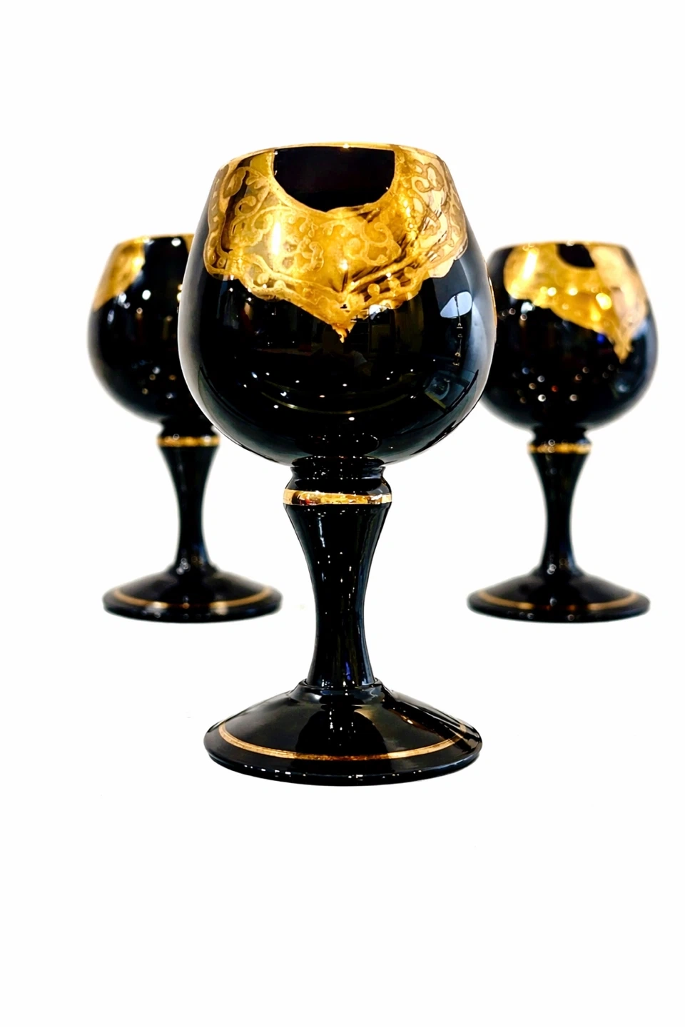 A dramatic set of three early 20th century–attributed black glass goblets, richly embellished with hand-applied raised gilt enamel in ornate cartouche motifs. Against the mirror-dark, obsidian body, the gold decoration reads like jewelry—dimensional, tactile, and sculptural—catching light with a warm antique glow. The interiors reveal subtle deep wine and midnight-toned undertones under illumination, adding depth and complexity beyond a simple black profile.