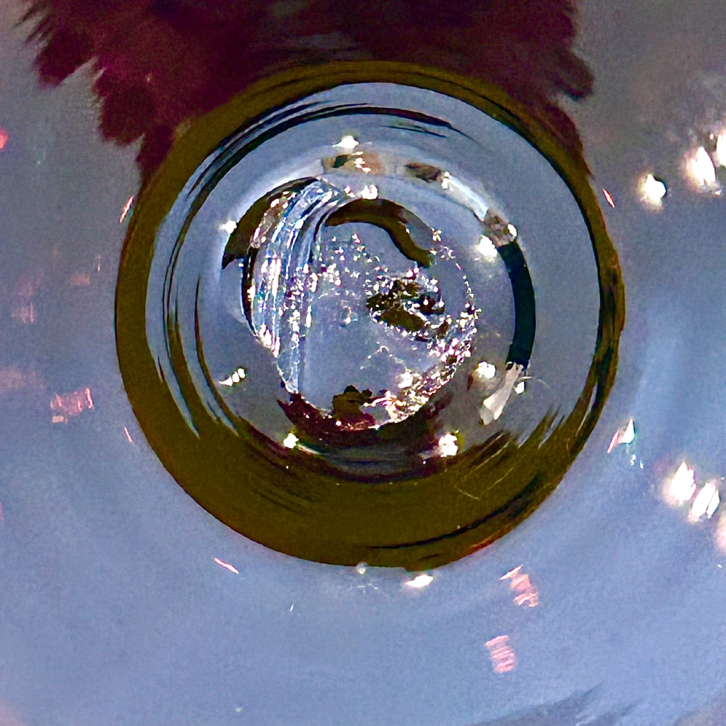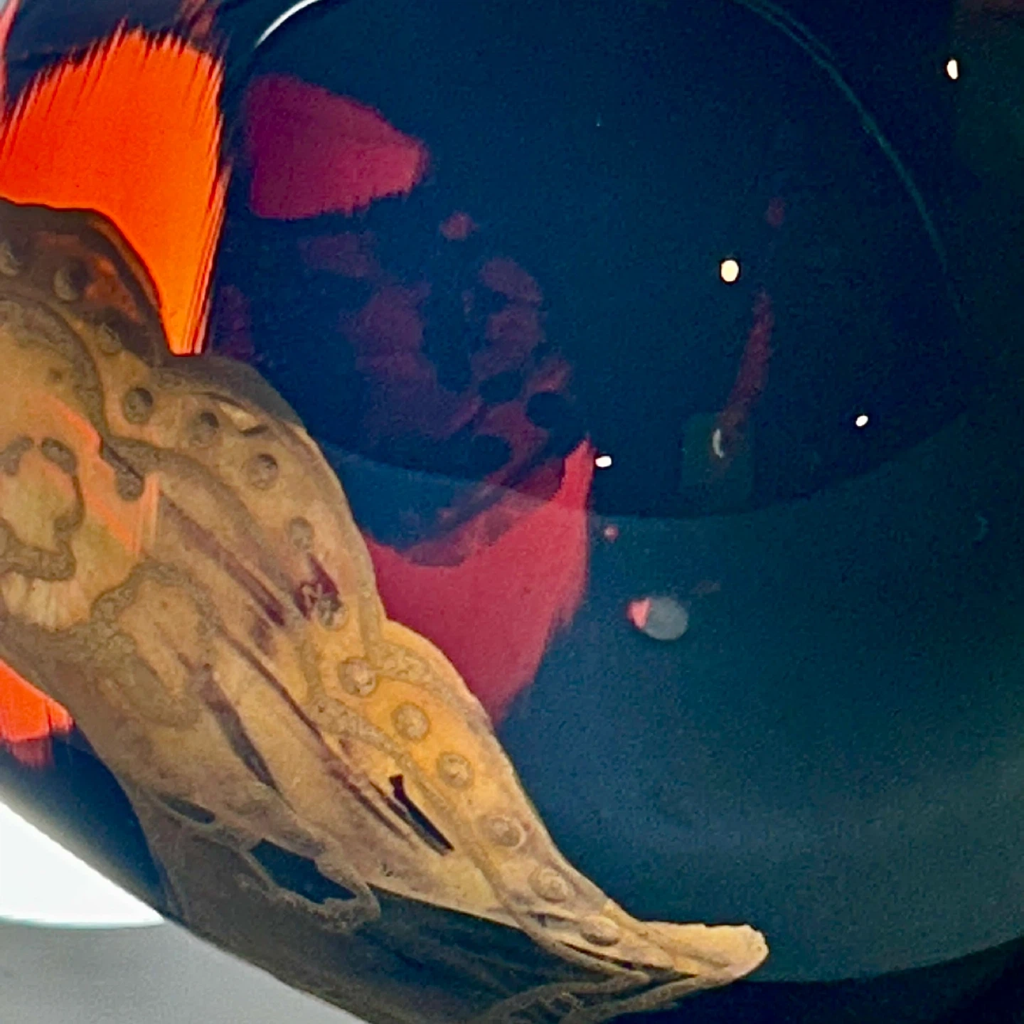 Techniques: Hand-blown glass; hand-applied raised enamel/gilt relief decoration; hand-finished bases