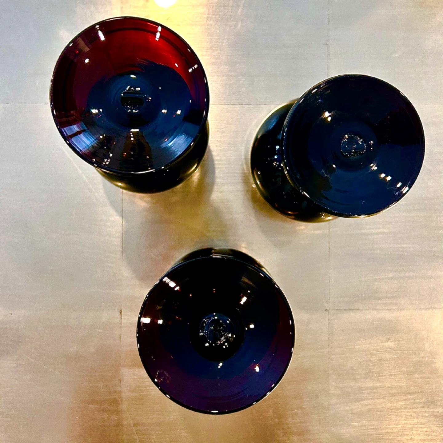 This is not a factory-identical set. Each goblet is individually hand-formed and hand-decorated, with slight variation in height and bowl profile consistent with artisanal production. Displayed together, they present as a matched trio with the kind of nuanced irregularity collectors associate with hand workmanship.