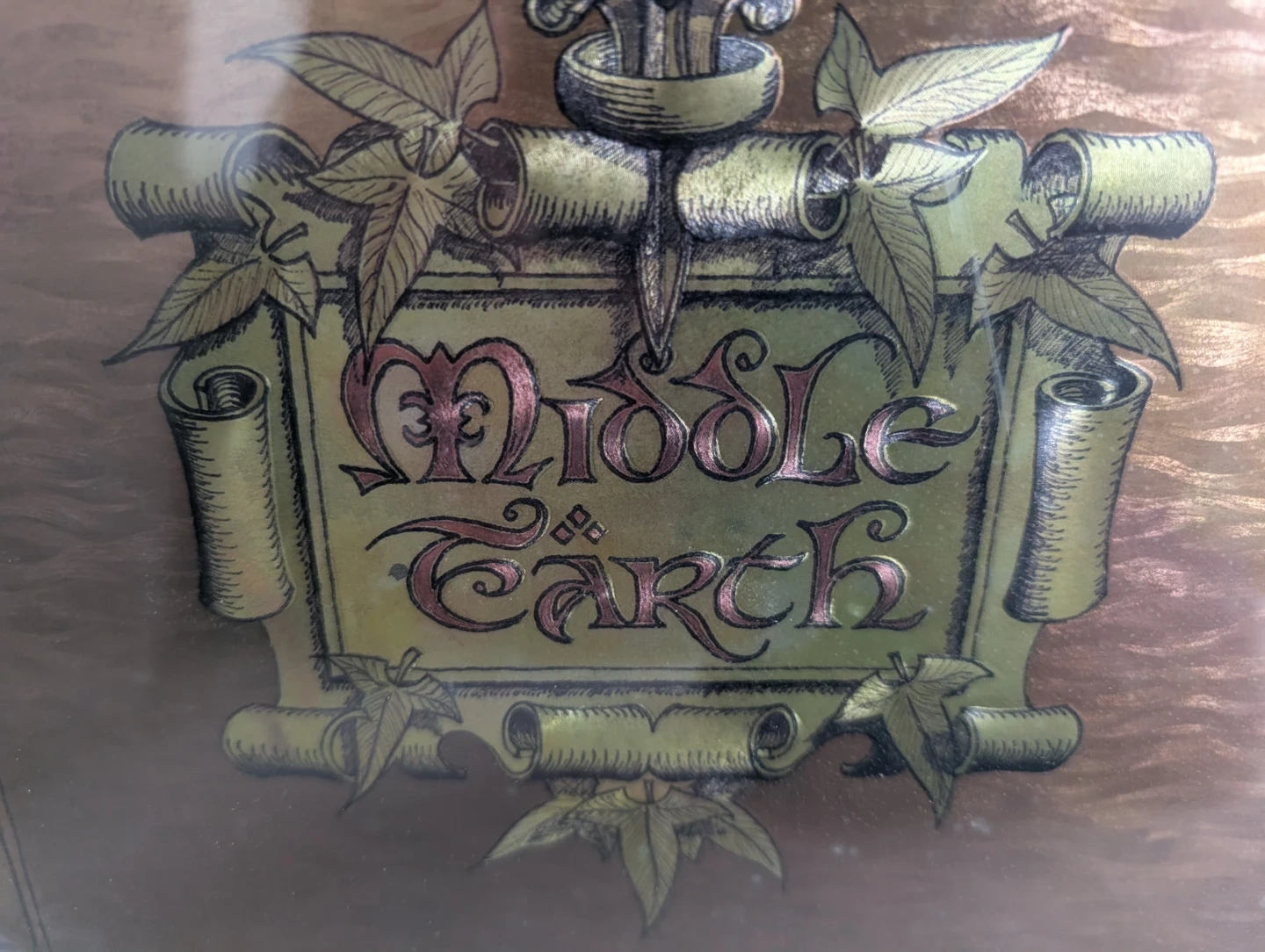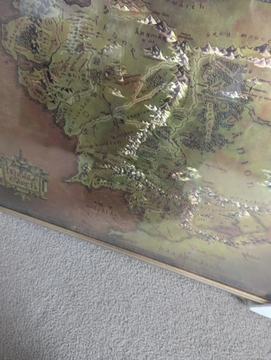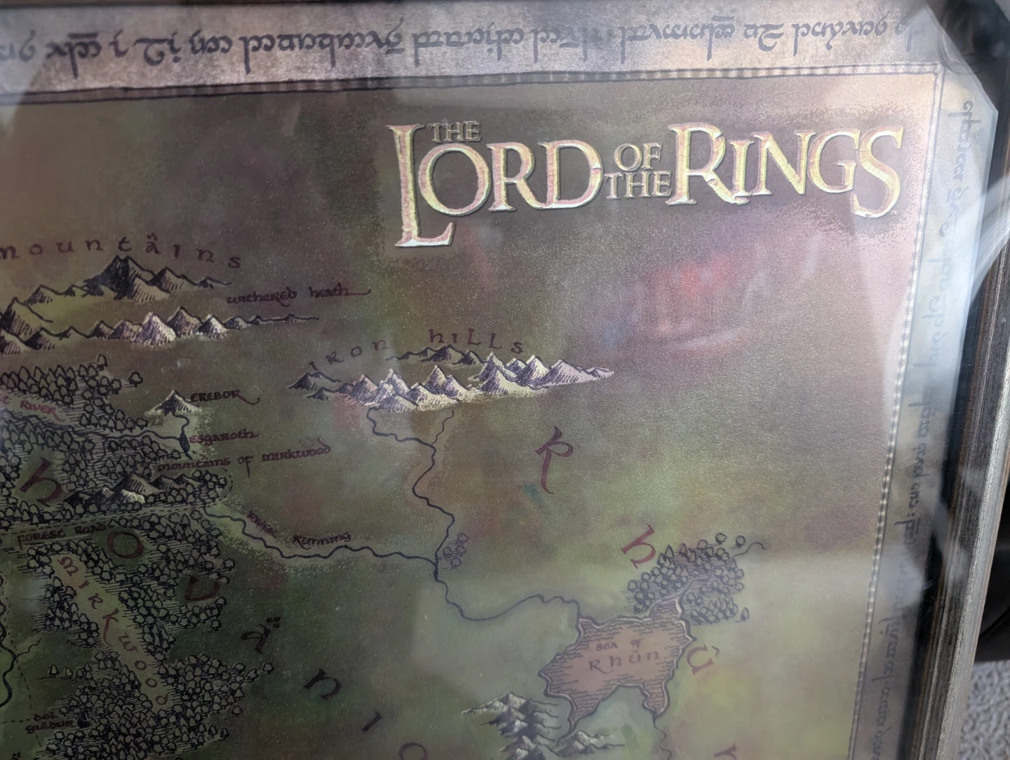 Framed map of Middle-earth from The Lord of the Rings. Detailed artwork shows various regions and locations. It's ready to hang!