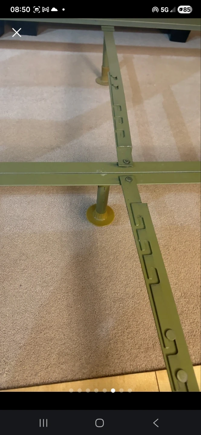 This is a sturdy metal bed frame. It's a standard size, suitable for most bedrooms. It includes centre support legs and a durable finish.
