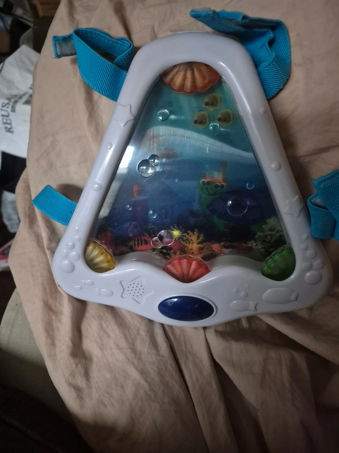 This is a baby water play mat with an ocean theme. It has colorful sea creatures and bubbles that move. Straps are included to attach it to a crib or stroller. It's great for tummy time play!