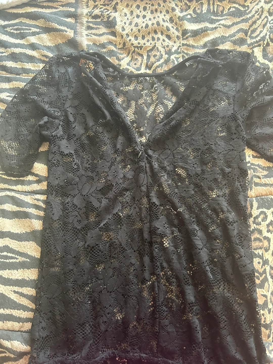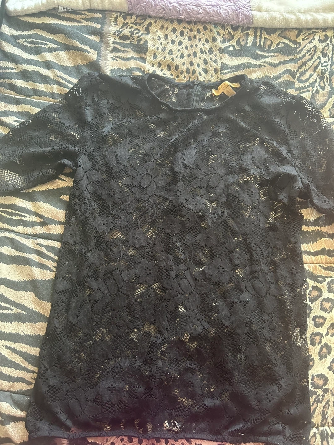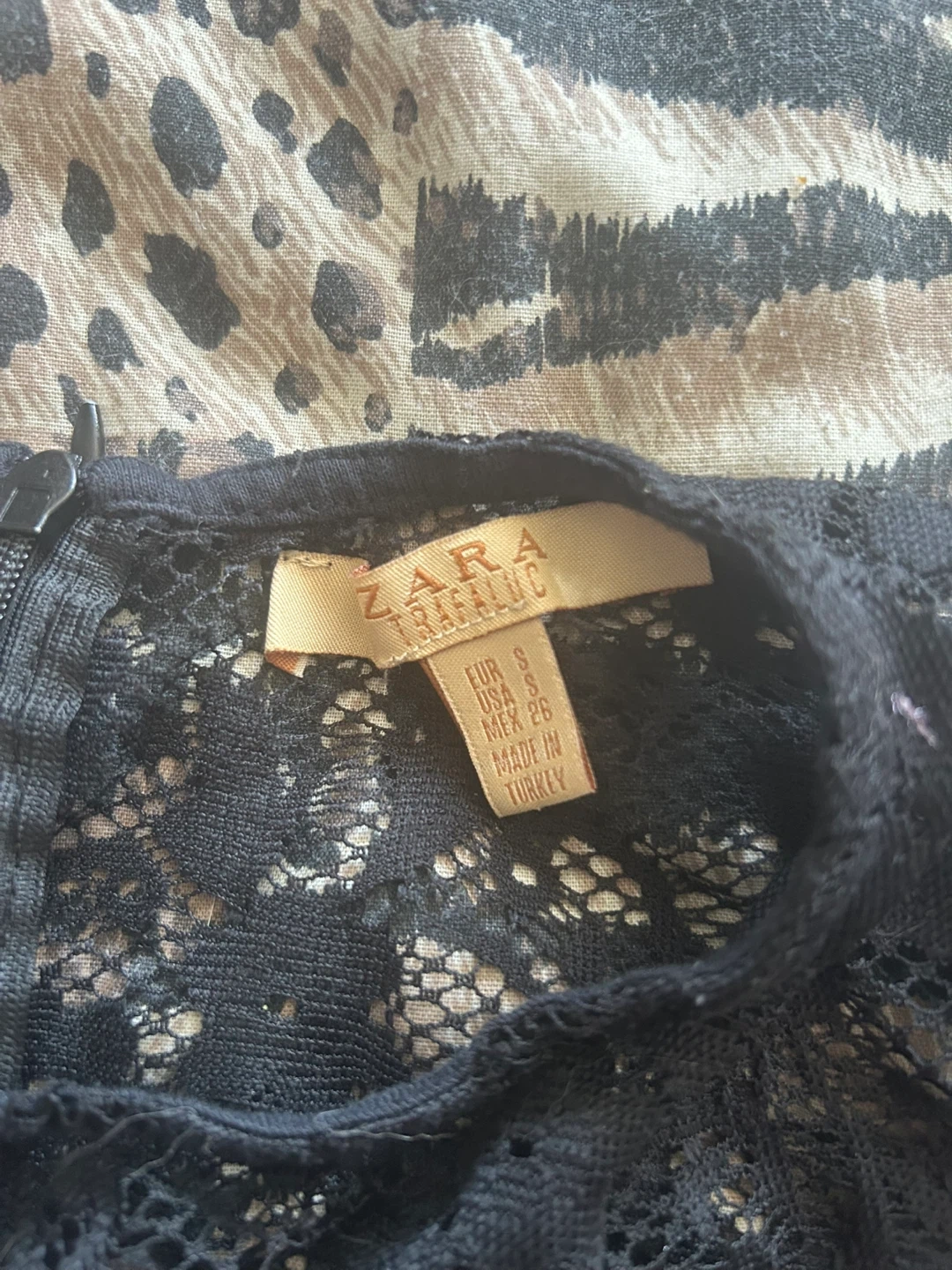 This is a black lace top from Zara. It's a size S and made in Turkey. It features a detailed lace pattern and short sleeves. This top would be great for layering over a camisole for a chic look!