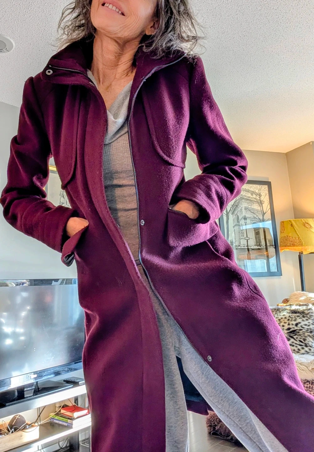 This Karl Lagerfeld coat comes in a rich plum colour and a wool blend. It's a size XS/TP with a zip-up front and pockets. A stylish outerwear option!