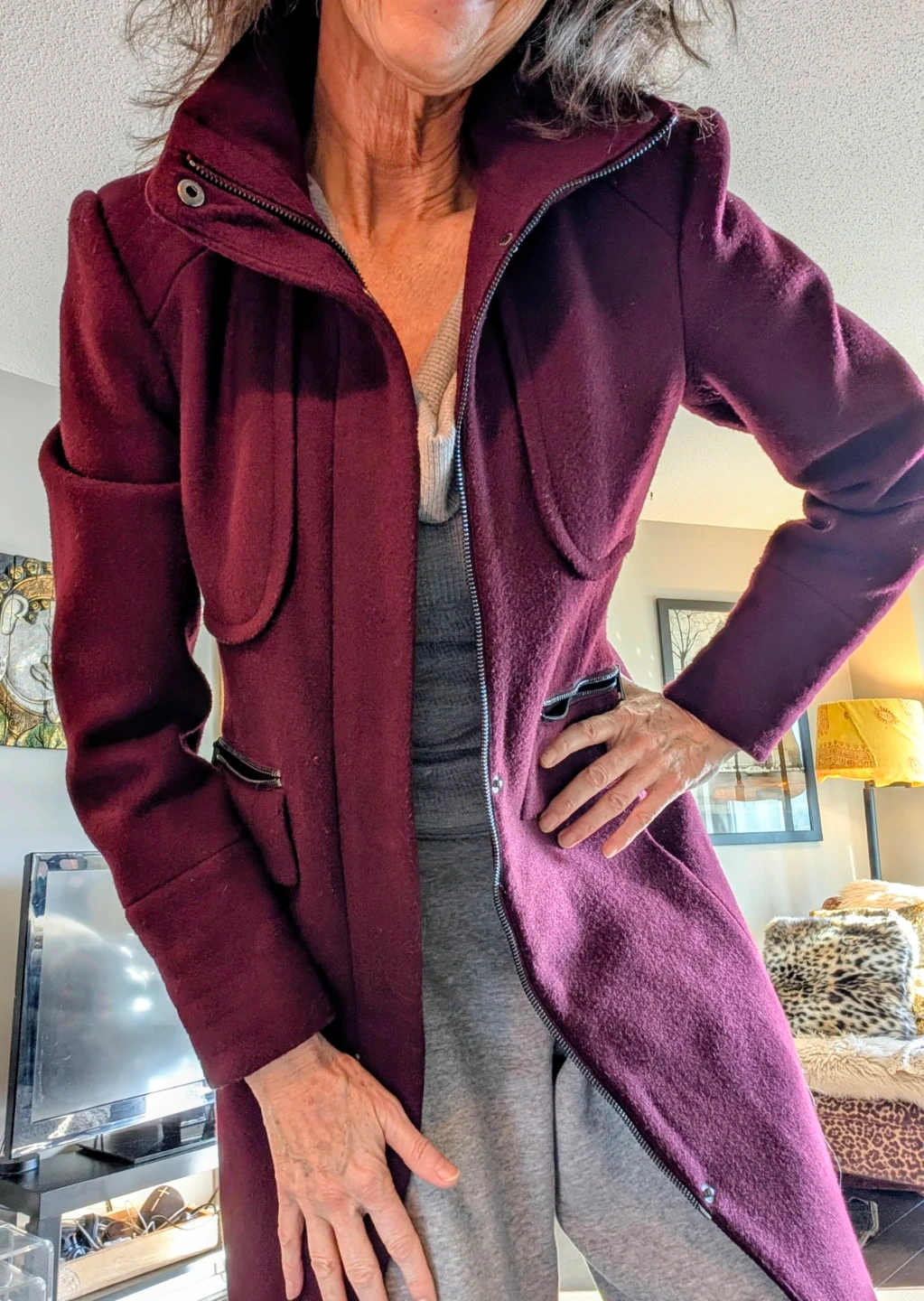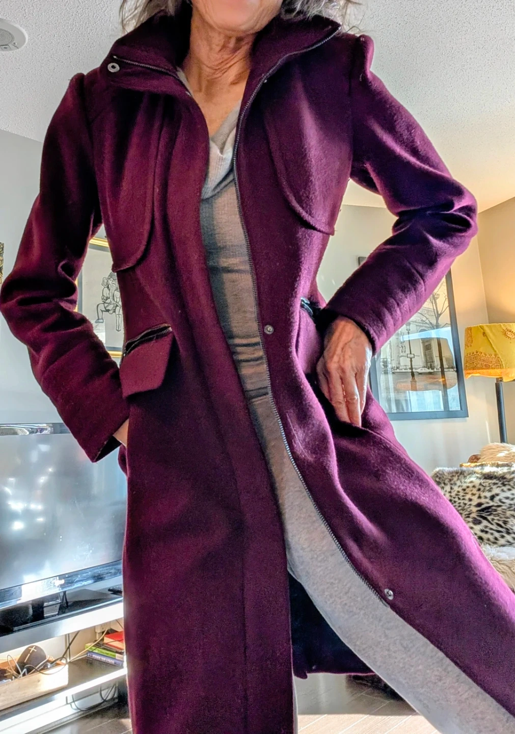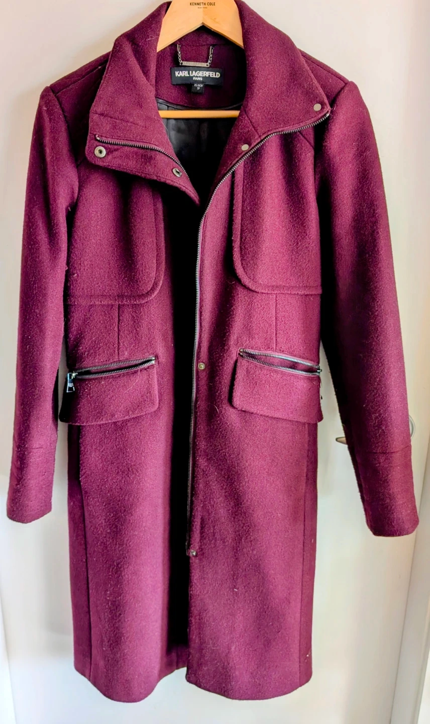 This Karl Lagerfeld coat comes in a rich plum colour and a wool blend. It's a size XS/TP with a zip-up front and pockets. A stylish outerwear option!