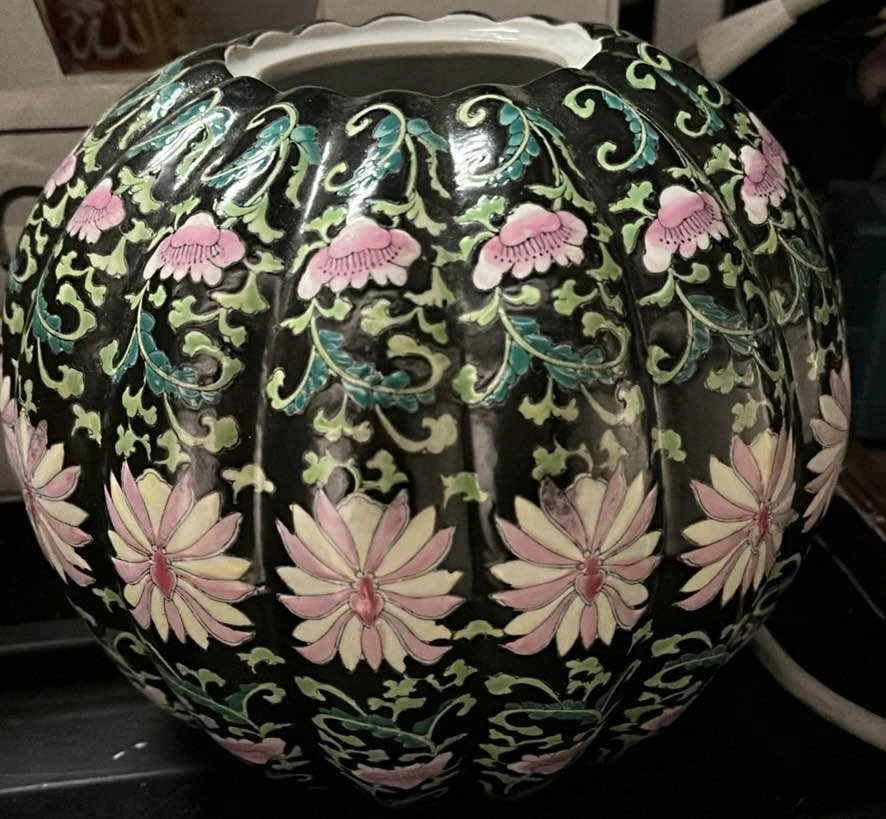 Beautiful decorative ceramic vase with a detailed floral pattern. Asian-inspired design with raised texture and a glossy finish. Perfect as a statement piece, planter cover, or shelf decor. Pick up at Cambie and 8th, Vancouver.