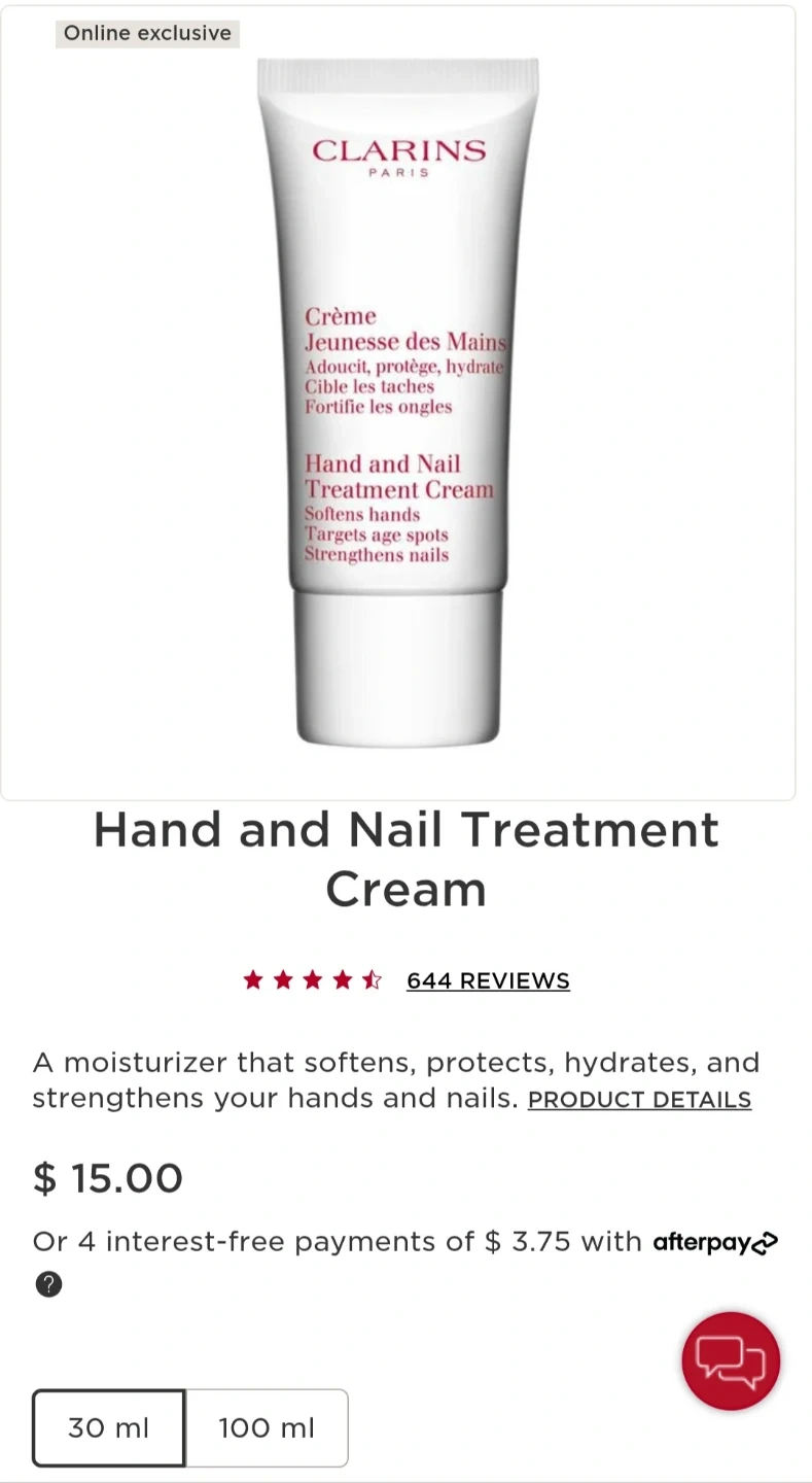 Clarins Hand and Nail Treatment Cream for softening and strengthening. It's 50ml, or 1.7 Oz. Net Wt. This cream helps soften hands and strengthen nails.
