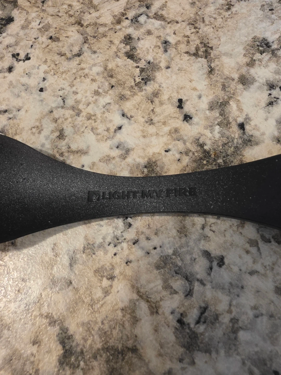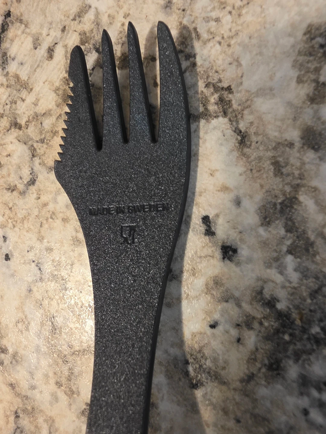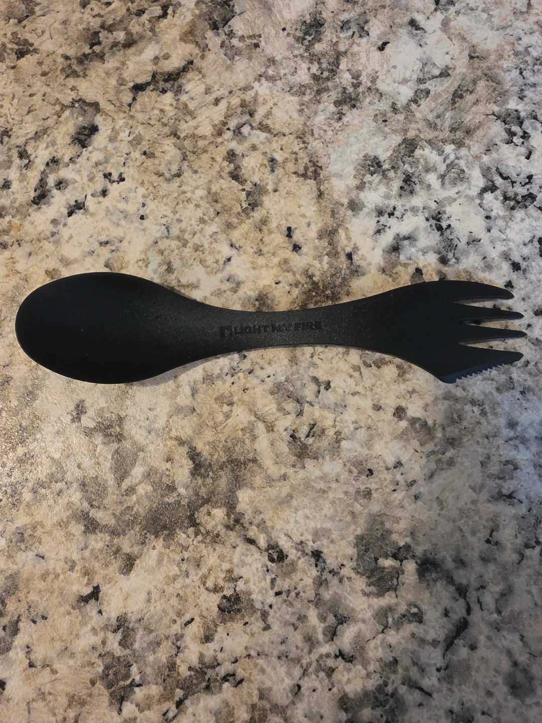 This is a black Light My Fire spork. It's made in Sweden and features a spoon, fork, and serrated knife edge. It's a handy utensil for camping or on-the-go meals!