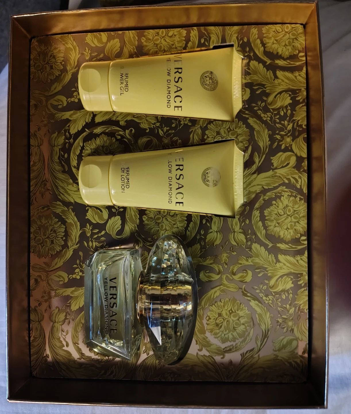 This is a Versace Yellow Diamond gift set. It includes a perfume spray, a shower gel, and a body lotion. Makes a lovely present!