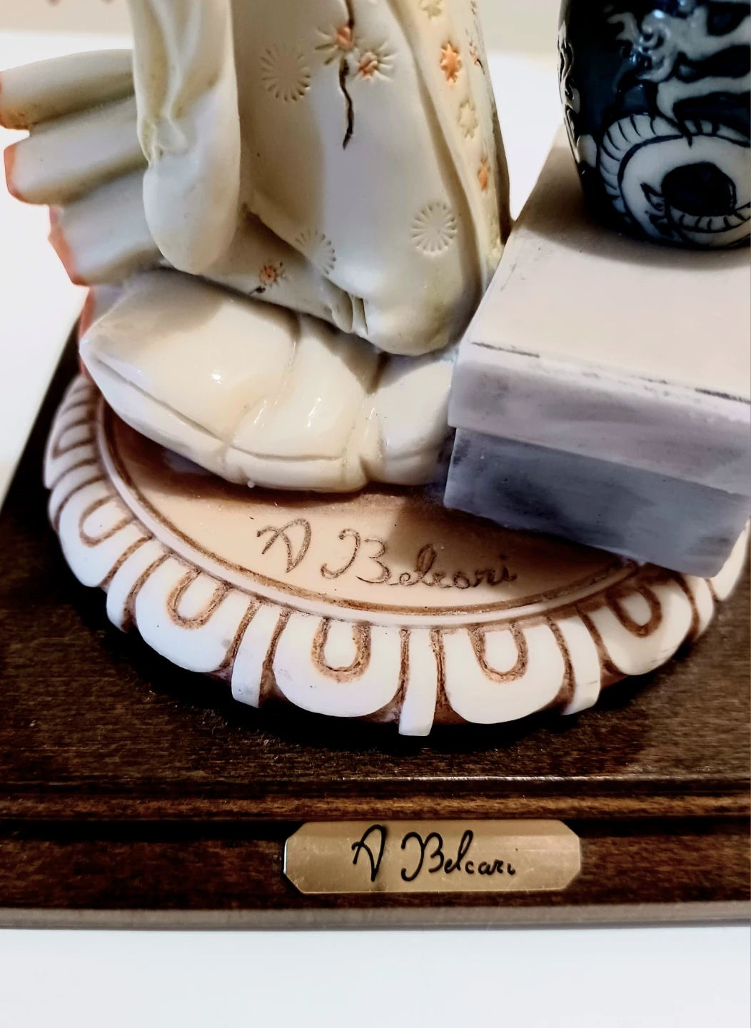 This is a Vintage A. Belcari Figurine is a Stunning collectible, showcasing a Geisha with a Vase. The piece is signed by the artist A. Belcari, adding to its Value and Authenticity.