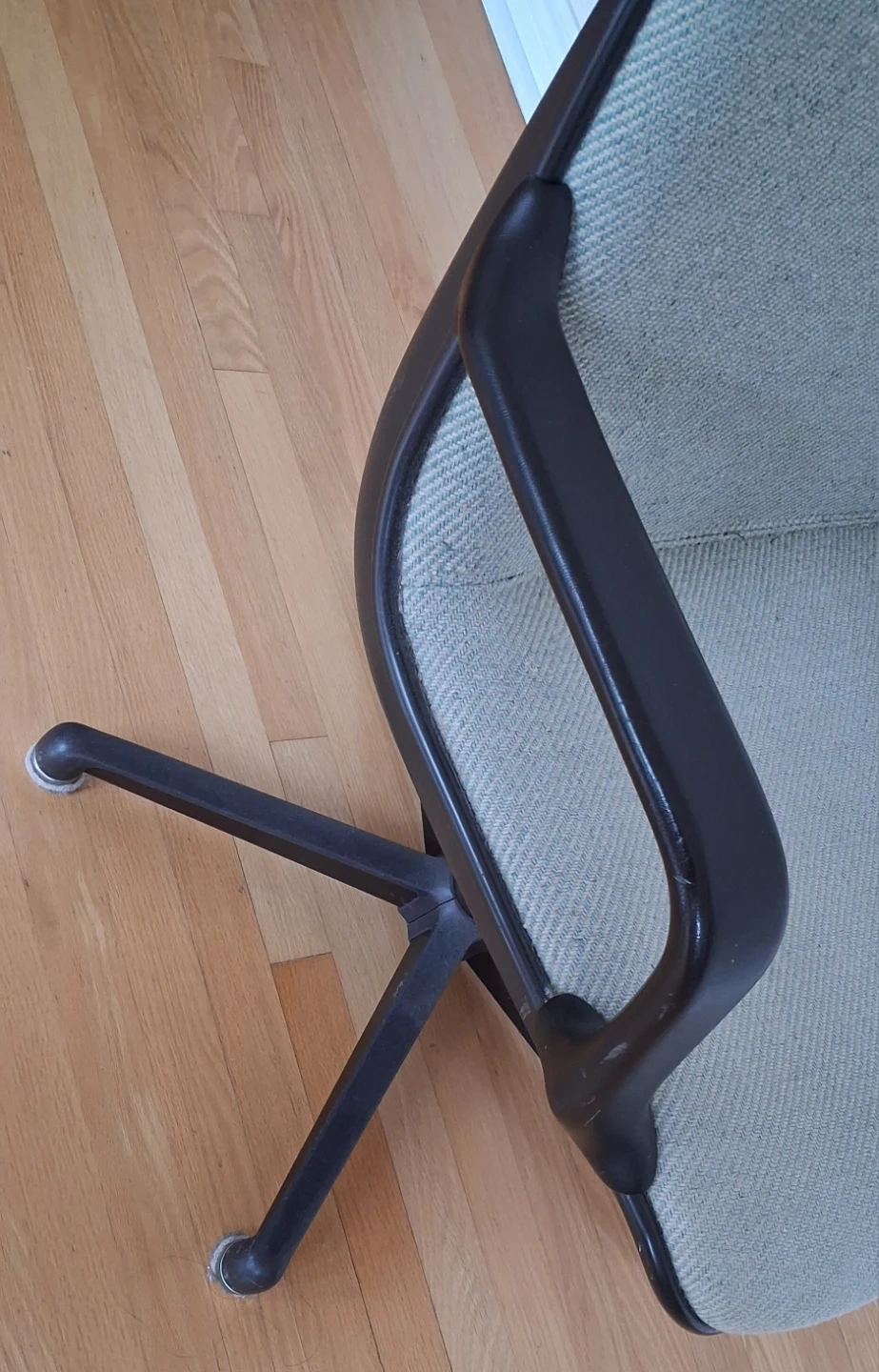 Used office swivel chair with light grey fabric upholstery and black plastic frame and arms. It's a basic, functional office chair with a five-star base. This chair's suitable for a home office or workspace.