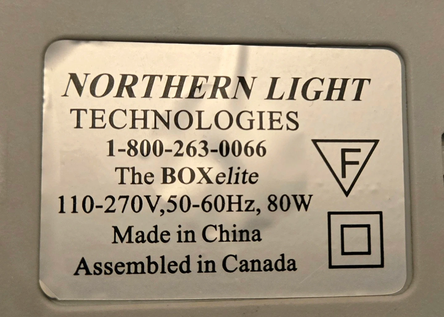 This Northern Light Technologies lamp is the BOXelite model. It operates on 110-270V with 50-60Hz and uses 80W. Assembled in Canada.