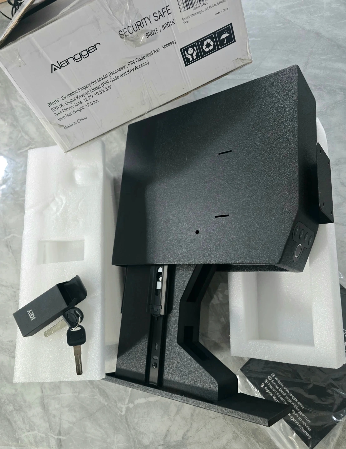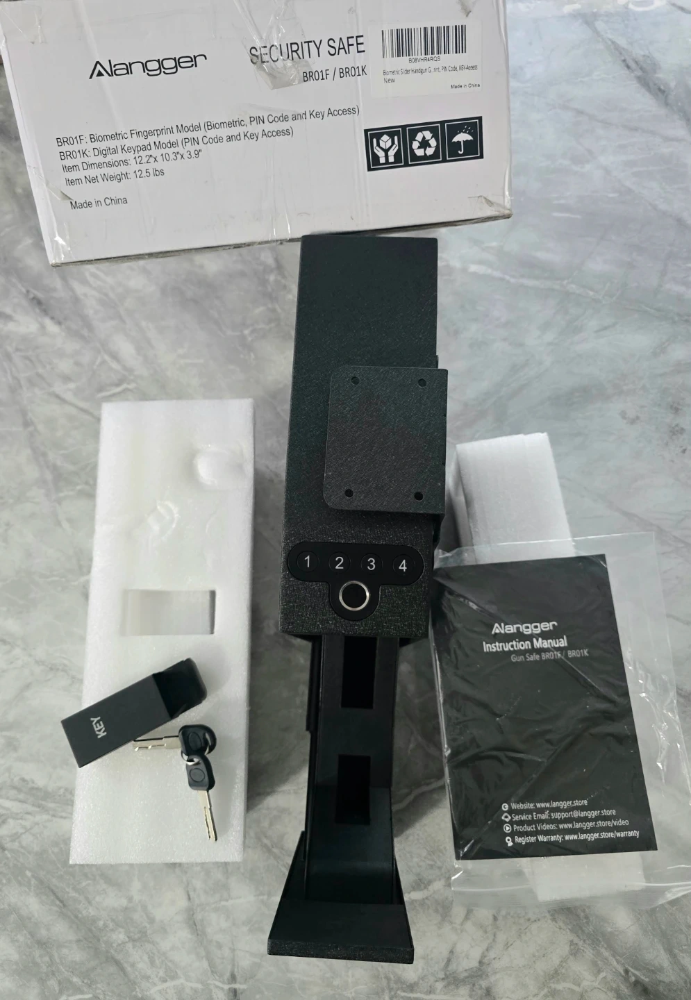 This Alangger gun safe offers quick access with a biometric scanner, backlit keypad, or manual key. It's designed for secure storage of handguns. The safe includes 2 keys and mounting hardware. Dimensions are 12.2" x 10.2" x 3.9". It's great for keeping firearms safely stored at home.