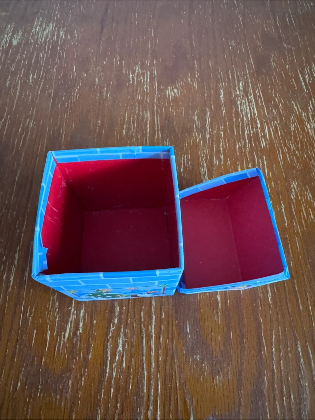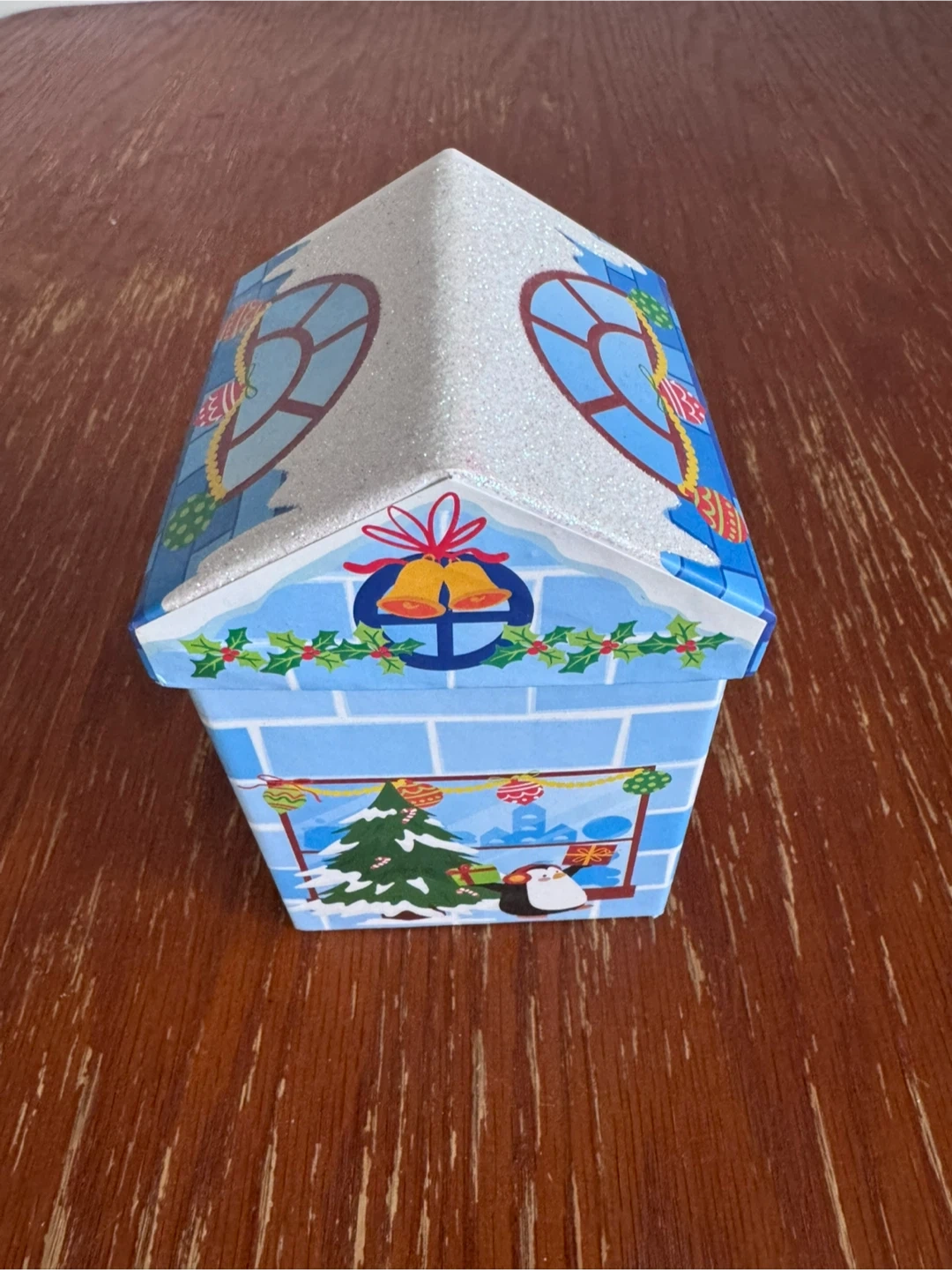 Festive house-shaped gift box, perfect for small holiday presents. It's made of cardboard with a bright blue brick design and Christmas imagery. The box has a lid and a glittery roof.