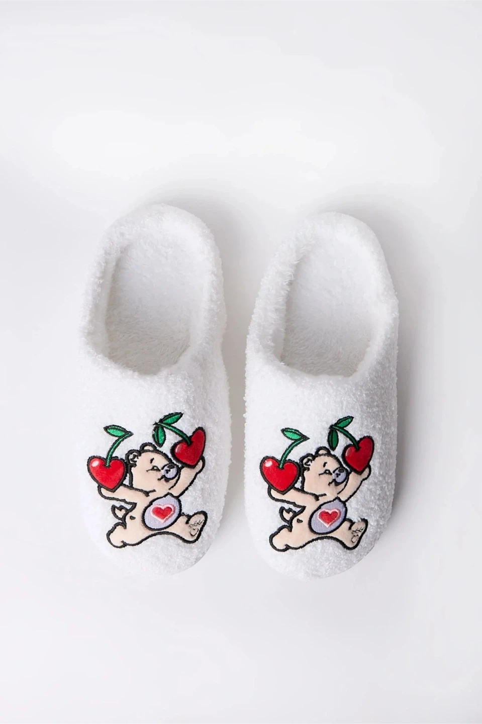 Cozy white slippers featuring a cute embroidered bear holding cherries. Made from soft, fuzzy material for ultimate comfort. These slip-on slippers are perfect for lounging around the house! brand new.