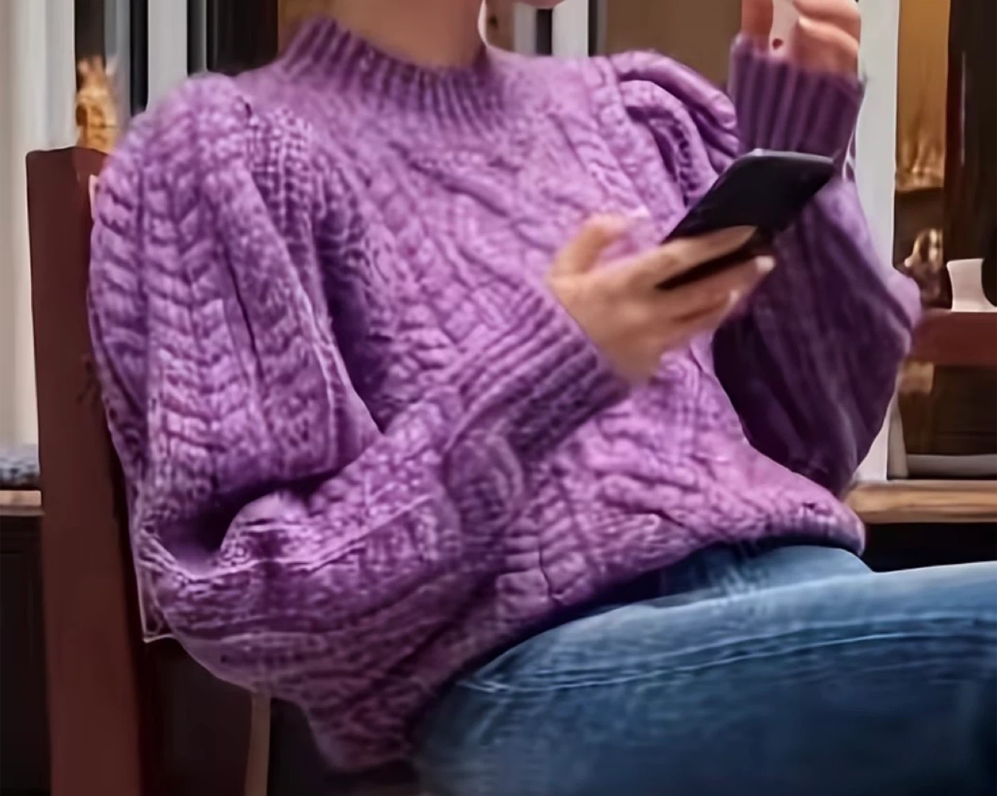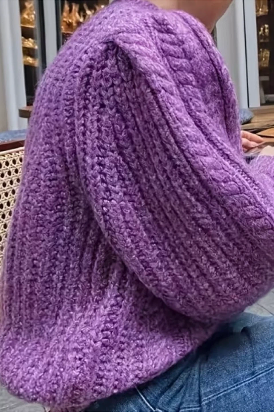 Cozy purple cable knit sweater with puffed sleeves. Fabric is a soft blend. Size is one-size, chest 39.4 inches, length 21.3 inches. Great for cooler weather!