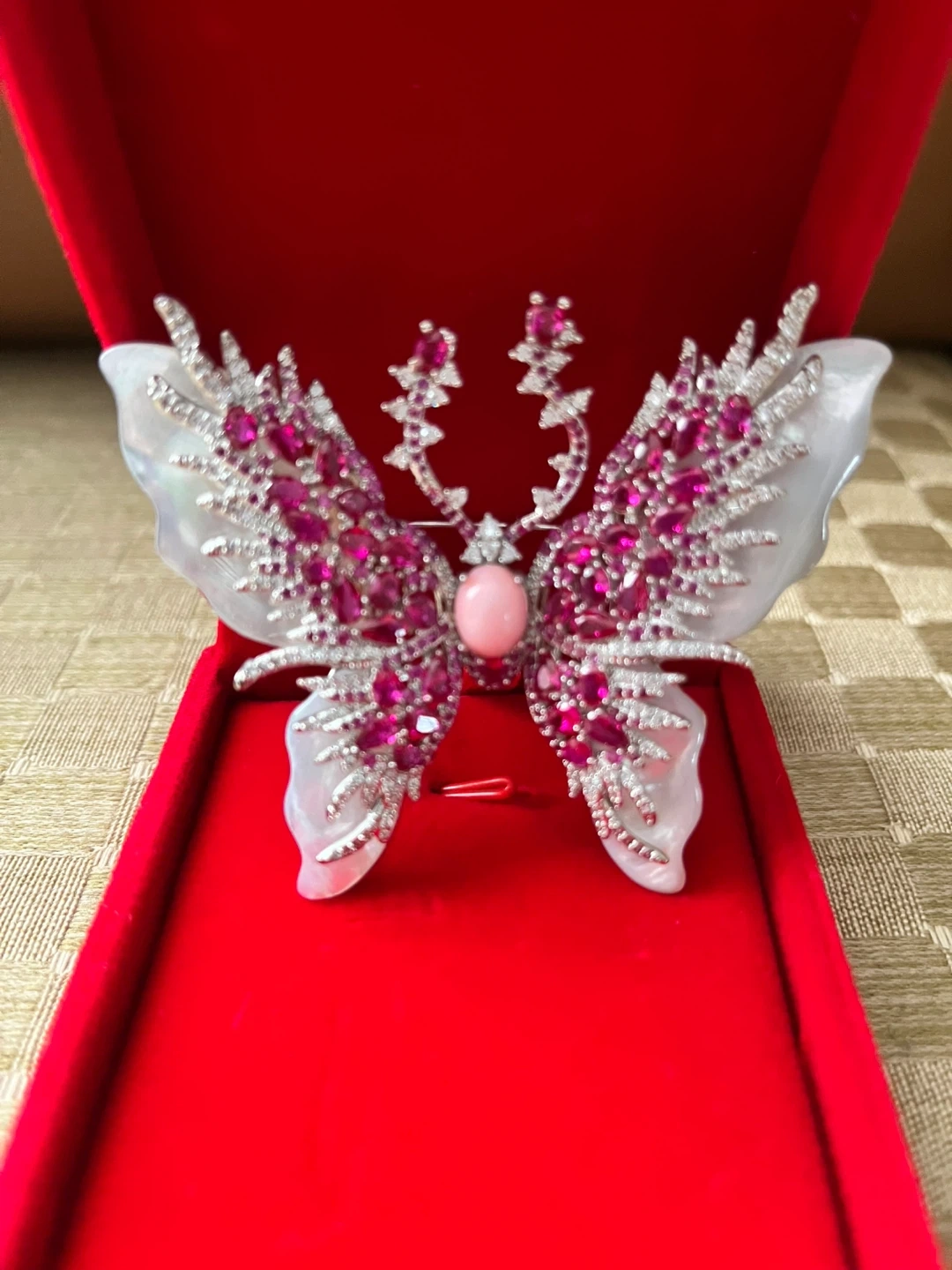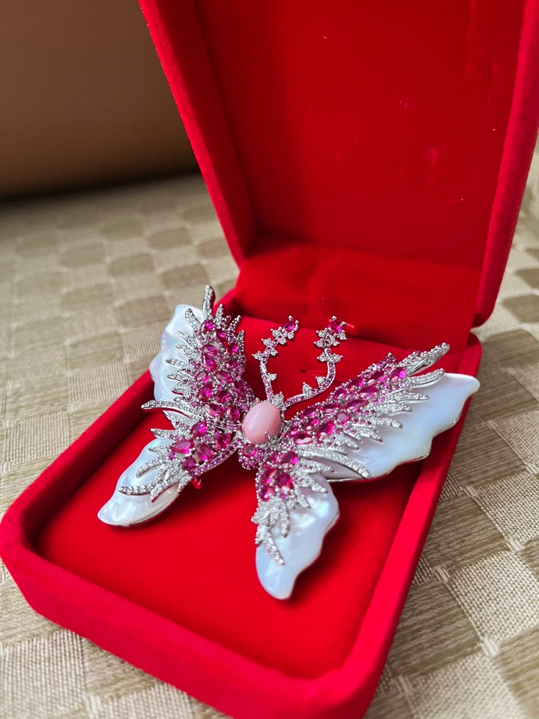 A beautiful butterfly-shaped brooch adorned with shimmering pink gemstones and lustrous pearl accents. This piece comes in a striking red velvet box, ready for gifting or safekeeping. It's a lovely accessory that adds a touch of elegance!
