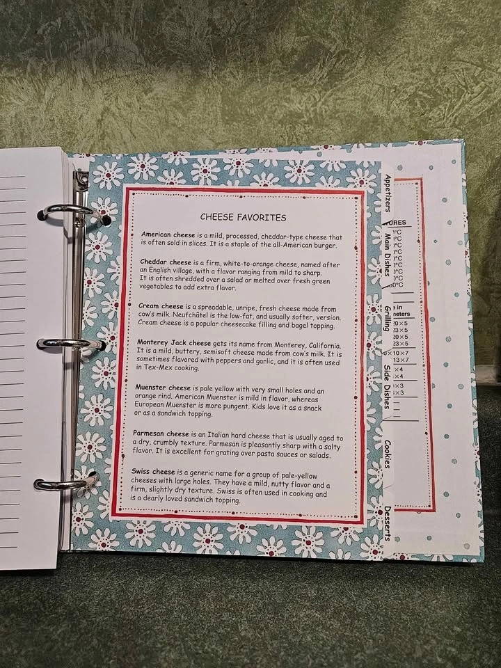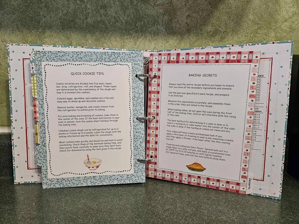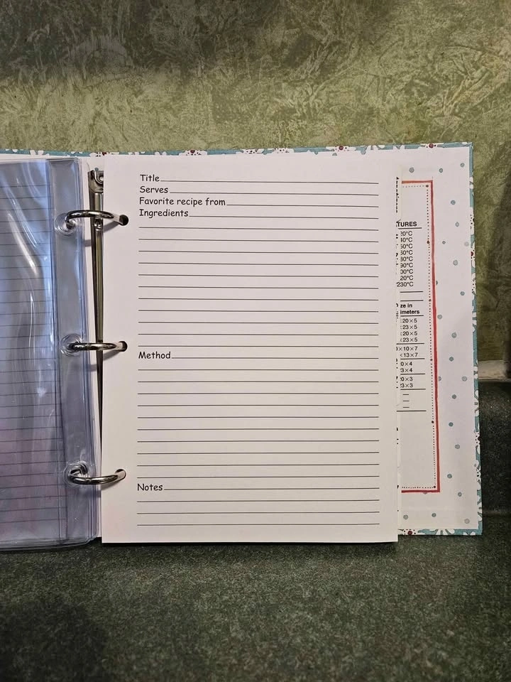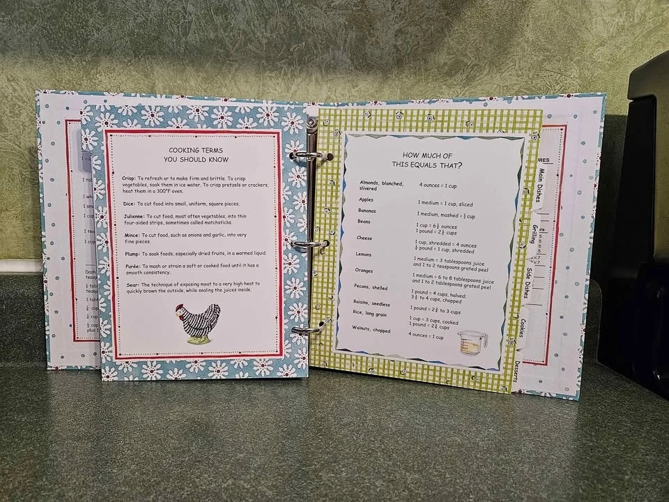 Includes everything you need to organize your recipes. 100 Recipe pages, 6 tab dividers, 2 splash guards, 6 vinyl sleeves, Measurements, hints & cooking tips. Book measures 8" X 9" X 1.5". Pick up is Appleby and Fairview in Burlington.
