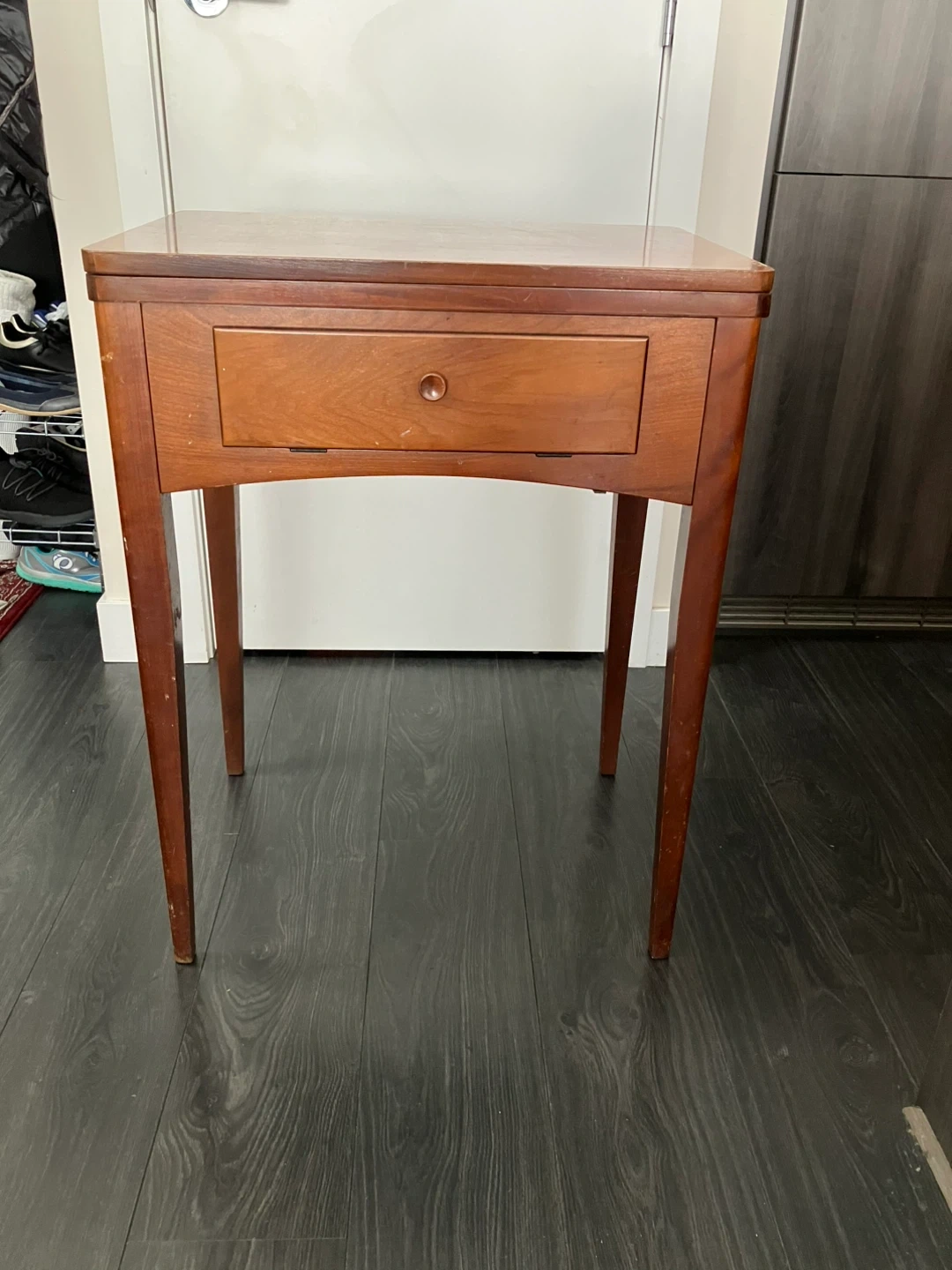 A wooden sewing machine table with a flip-top surface and a single drawer. It has a classic design and can be folded down for storage. Perfect for any crafter looking for a dedicated sewing space!