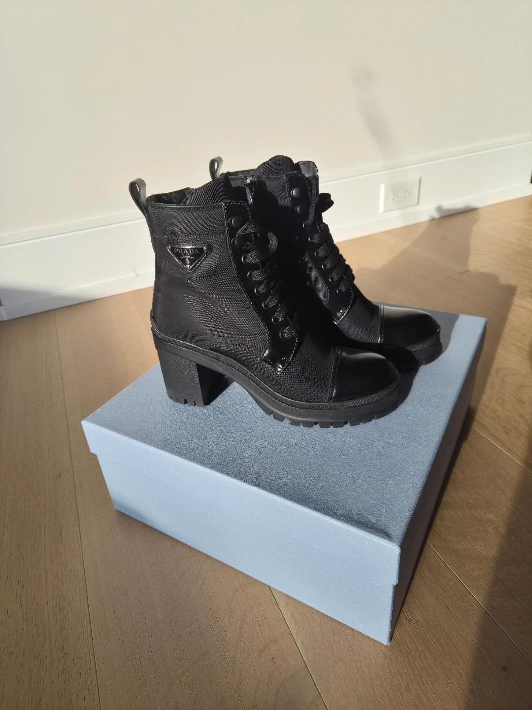 Stylish Prada combat boots in black. These boots are made from durable nylon with patent leather accents. They feature lace-up closure and a sturdy block heel and slim fit. Comes with the original box and packaging. Price negotiatable.