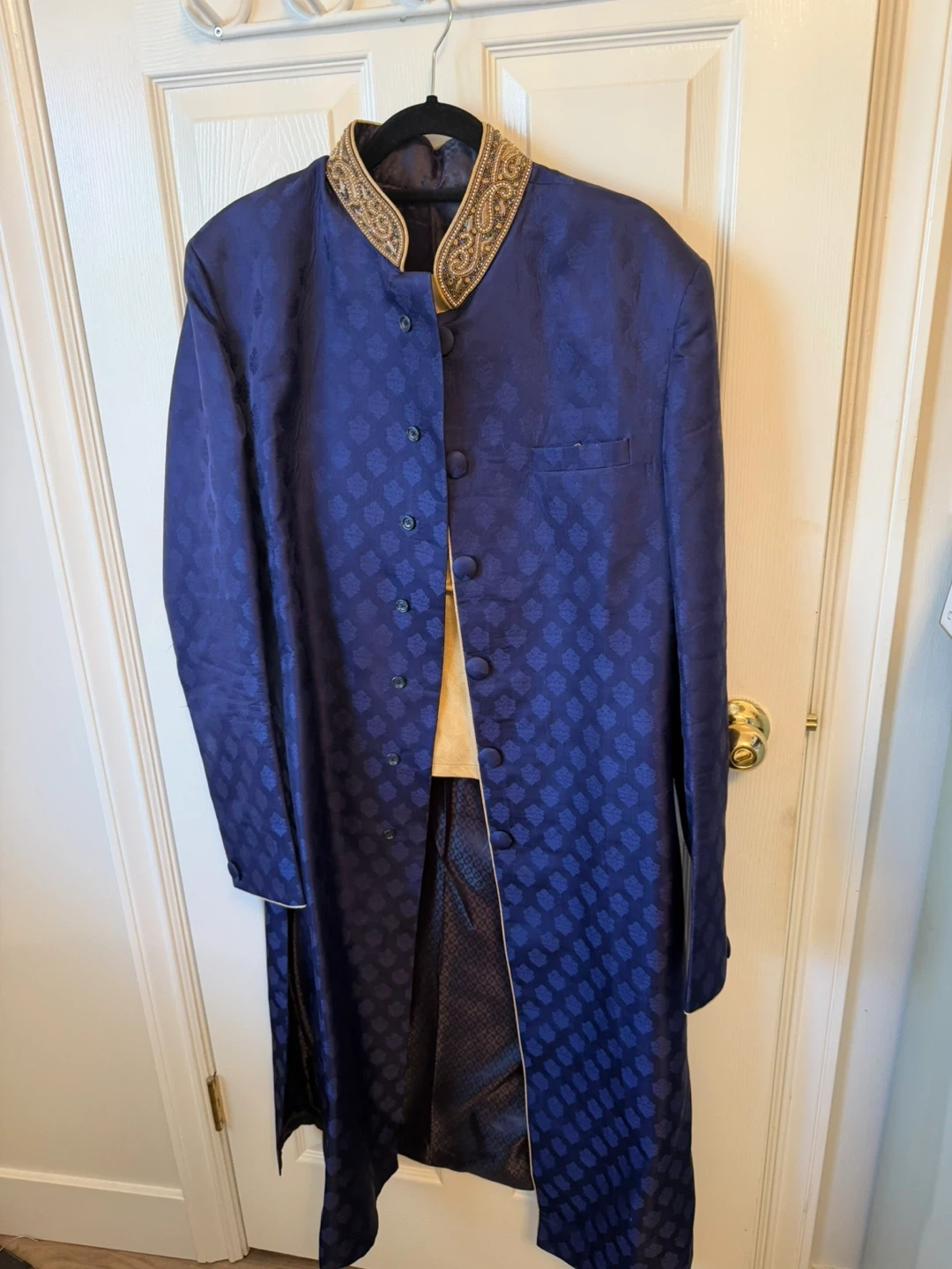 A traditional men's blue sherwani with intricate gold embroidery on the collar. This garment features a patterned texture and button-up front. It's perfect for formal occasions and cultural events.