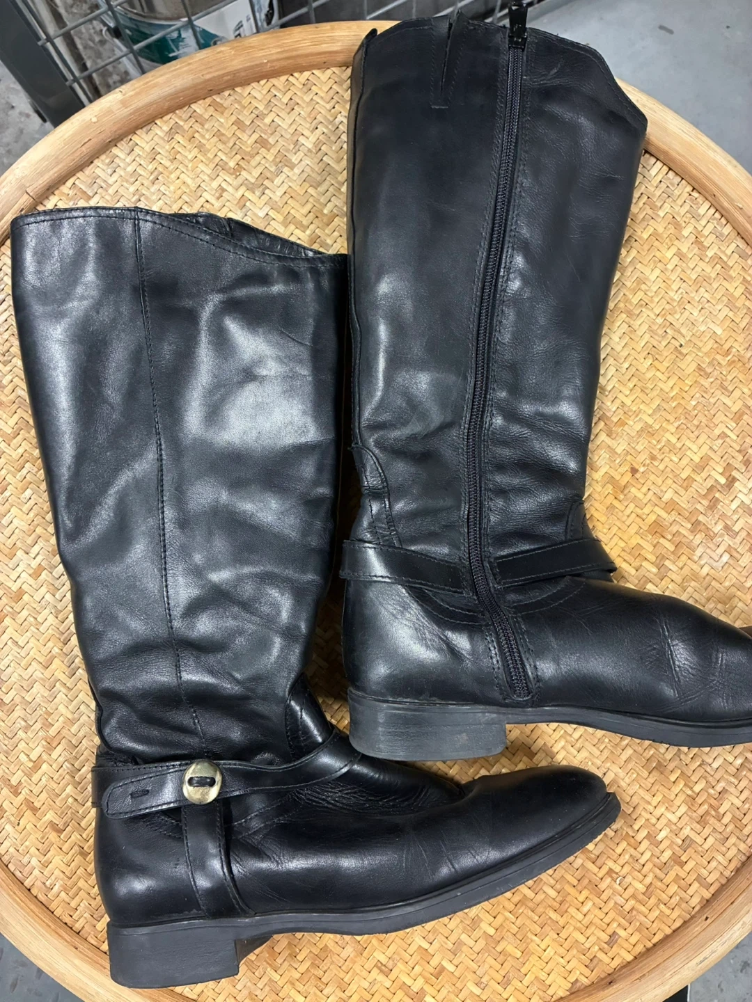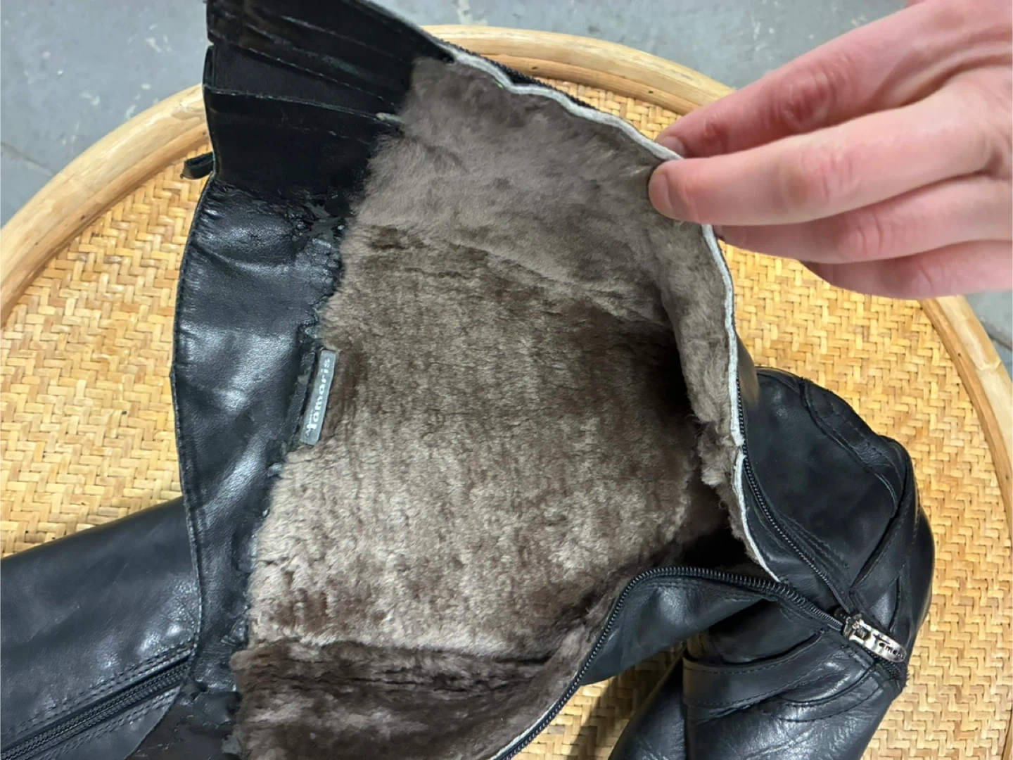 Tamaris black leather knee-high boots. Lined with soft faux fur for extra warmth. Has a side zipper and buckle detail.