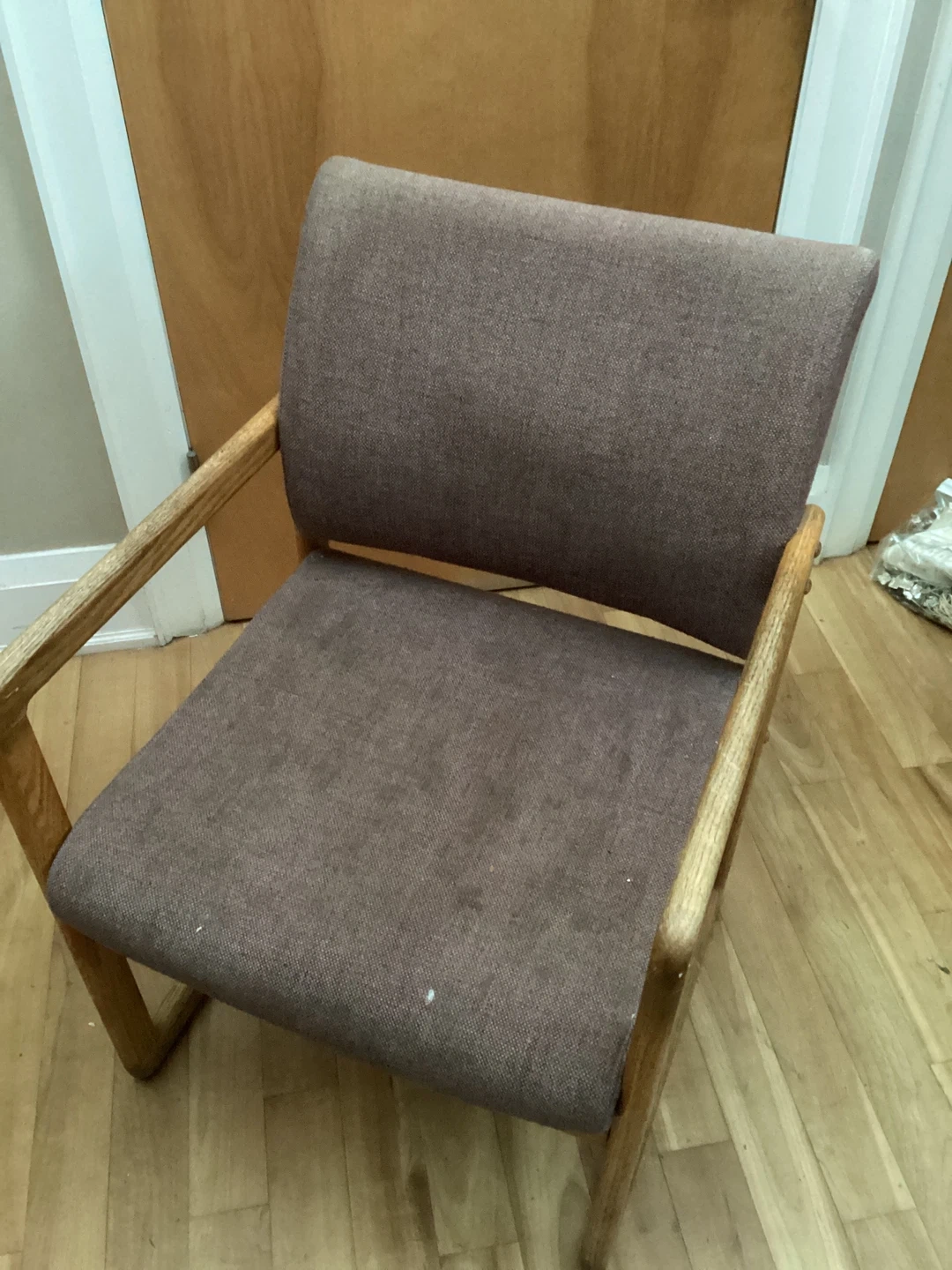 This armchair features a durable wooden frame and comfortable upholstered seat and back in a brown fabric. Measures approximately 22 inches wide and 30 inches tall. Very sturdy for older people who need good arm support. Fabric is in good shape… just needs a good clean!
