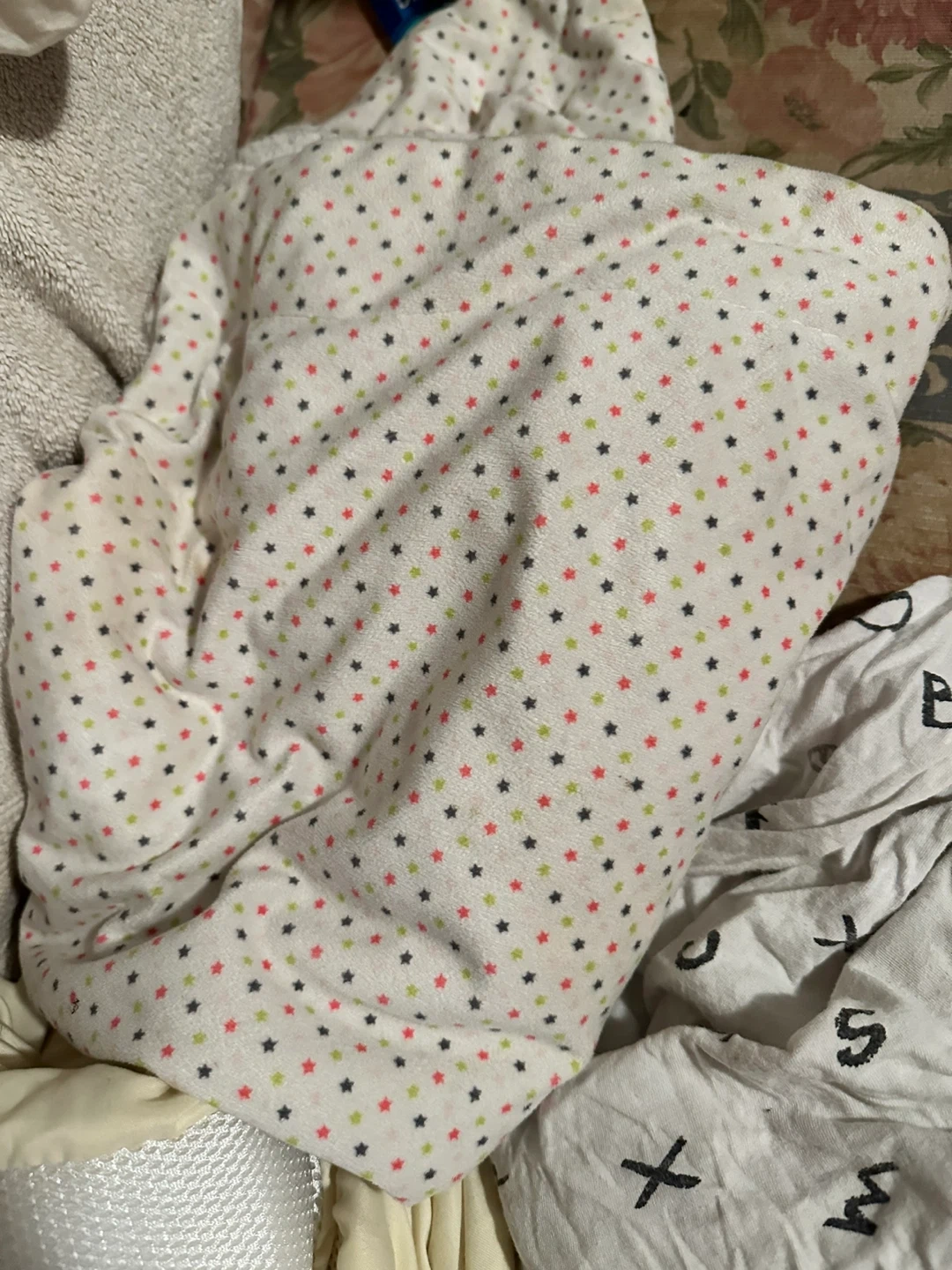 Cozy white baby blanket covered in a pattern of small red, green, and grey stars. Soft fabric construction for ultimate comfort. Perfect for keeping your little one snug!