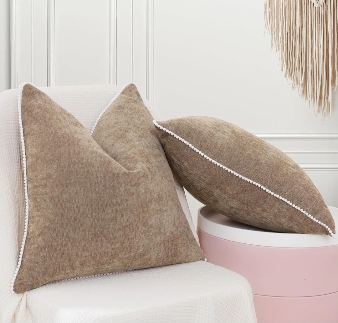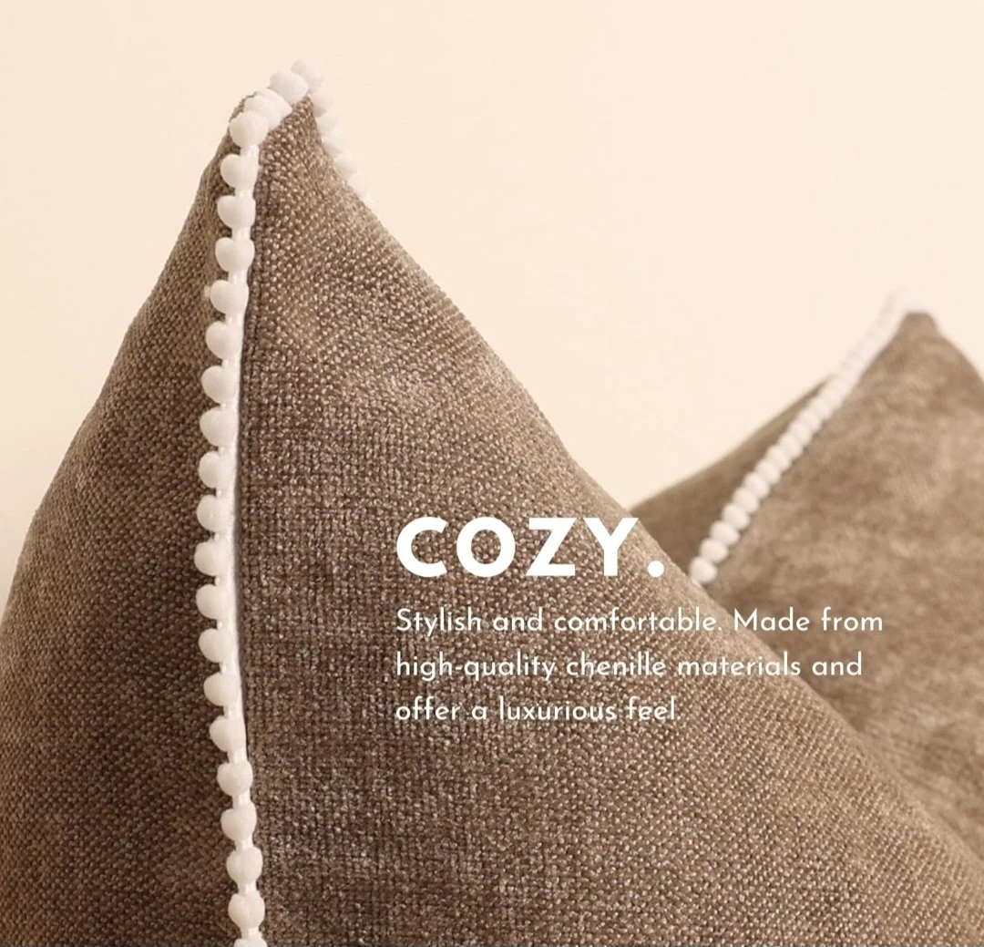 This decorative throw pillow cover is made from high-quality chenille material. It features a stylish pom-pom trim detail along the edges. The wine colour adds a touch of elegance to any room.
