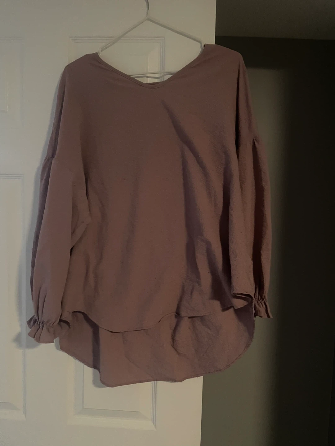 This is a women's long-sleeved top. It has a relaxed fit and a curved hemline. The fabric has a subtle textured pattern and is lightweight. It is in a used condition but still good.