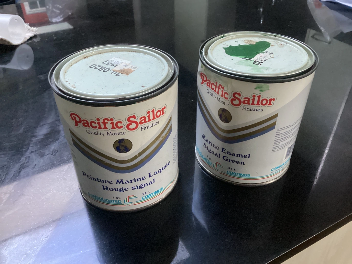 Two cans of Pacific Sailor Marine Enamel paint, one in Signal Red and the other in Signal Green. Each can is 94 L. This paint is designed for quality marine finishes. Only dipped into the green for a touch up. Both paints good. I think this isvan exceptional price for both cans.