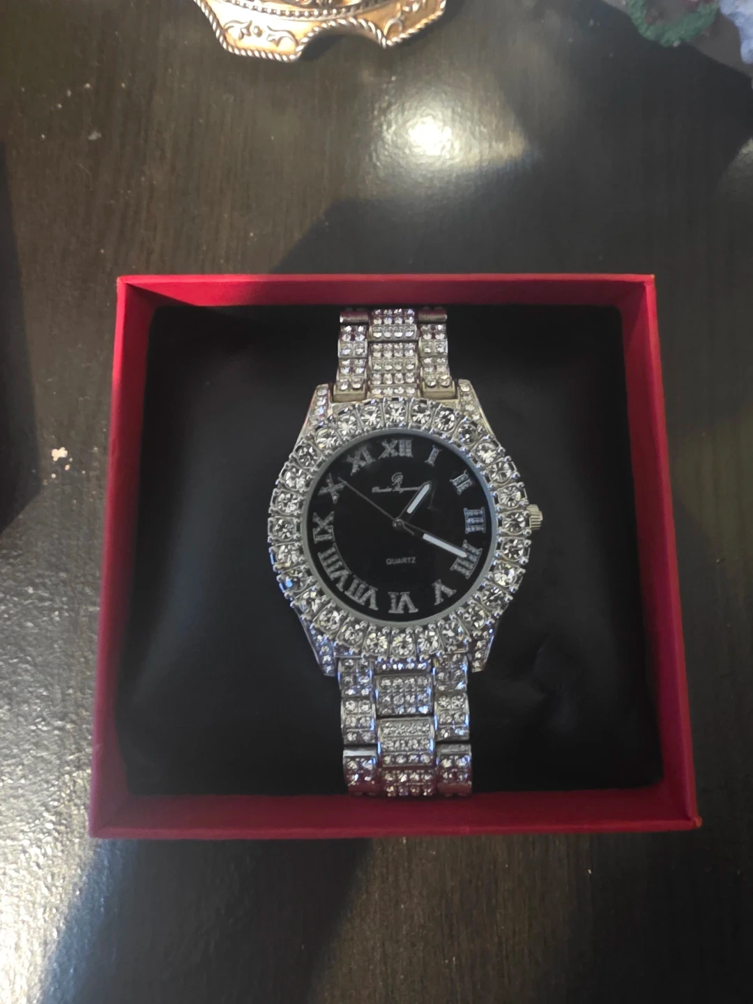This Charles Raymond watch features a silver-tone metal band and a black dial. It's accented with sparkling crystals around the bezel. Quartz movement. Comes in a red gift box.