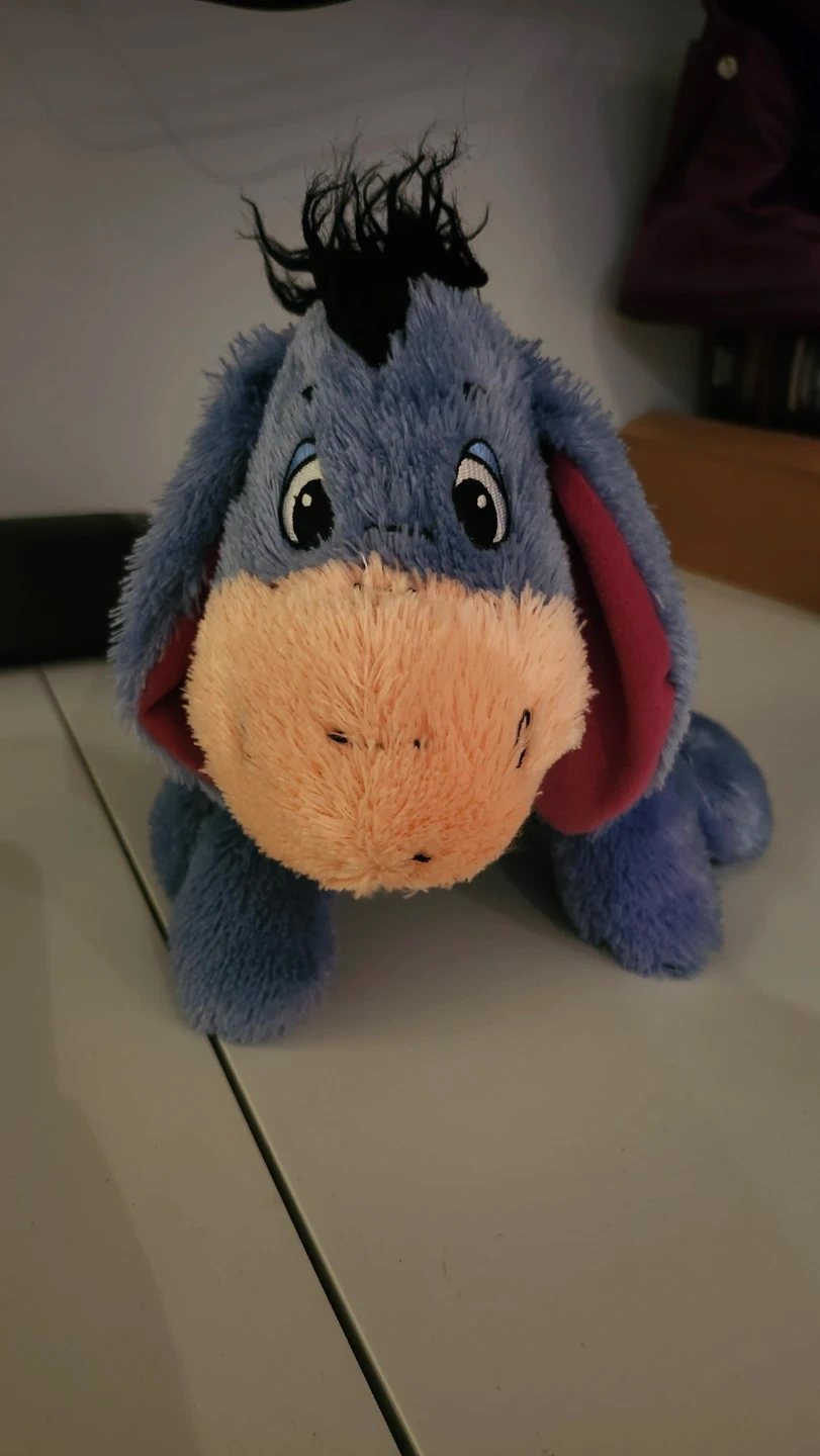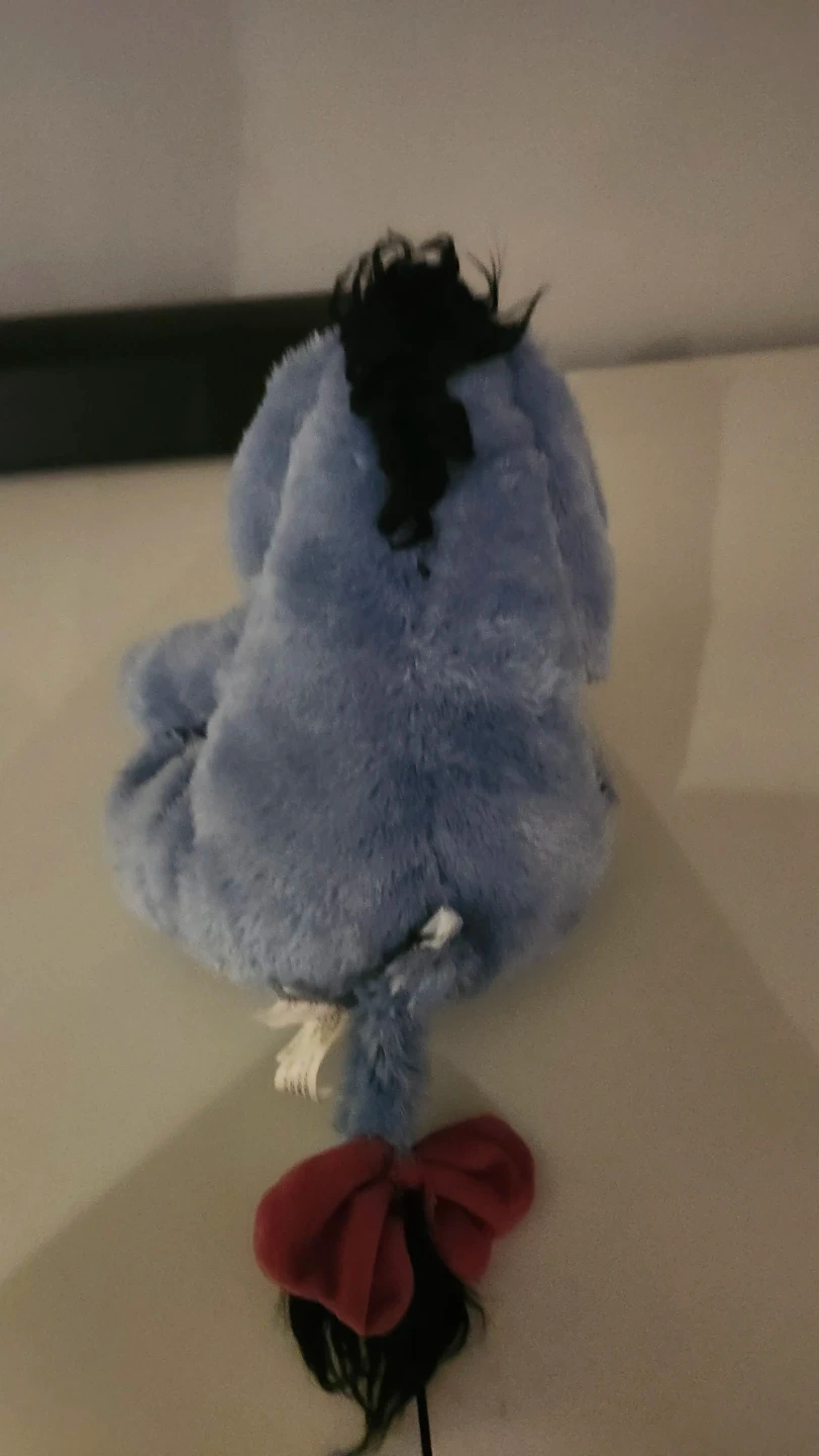 This is a soft Eeyore plush toy from the Disney Store. It's blue with a pinkish snout and a detachable tail with a red bow. A fun companion for any Winnie the Pooh fan!